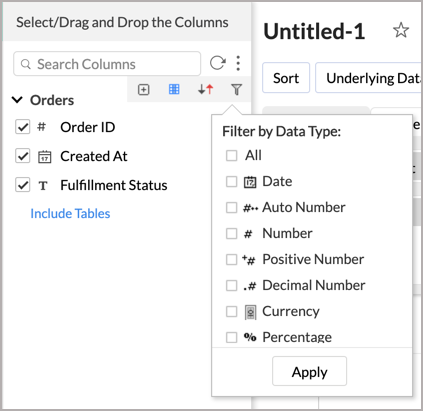- Apply Filters: This option is useful when you need to filter the columns based on the data type.