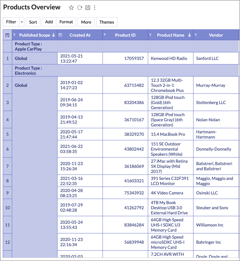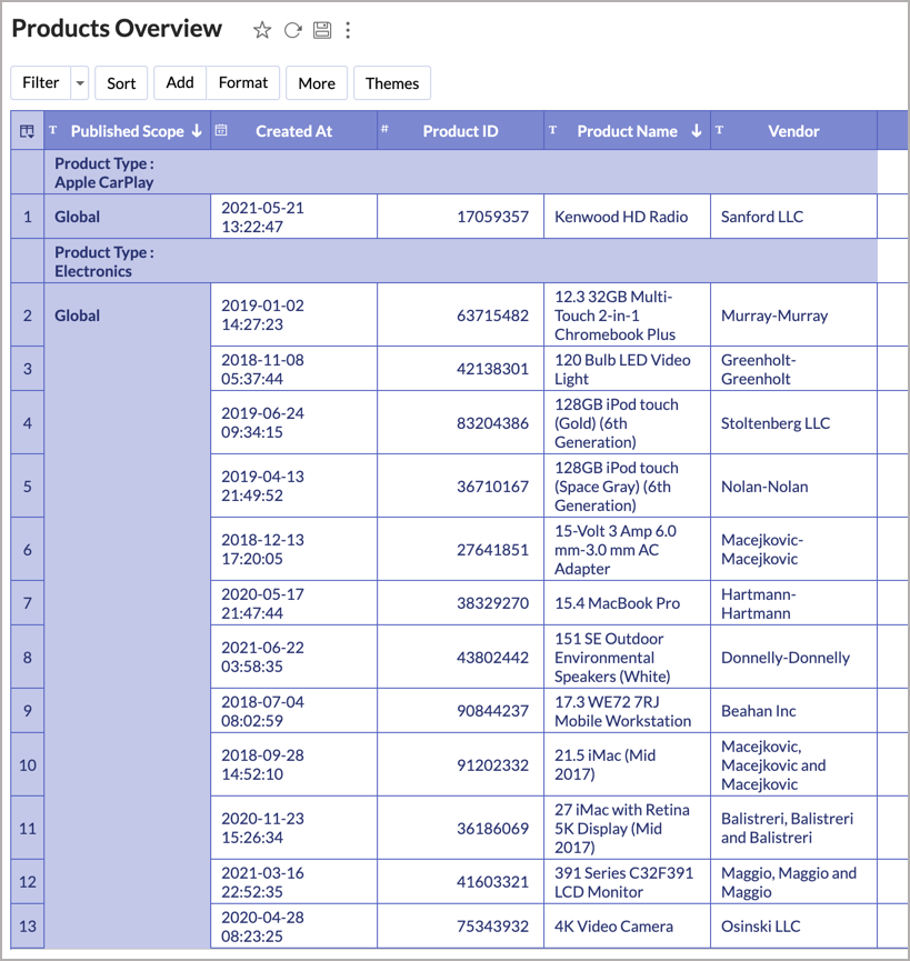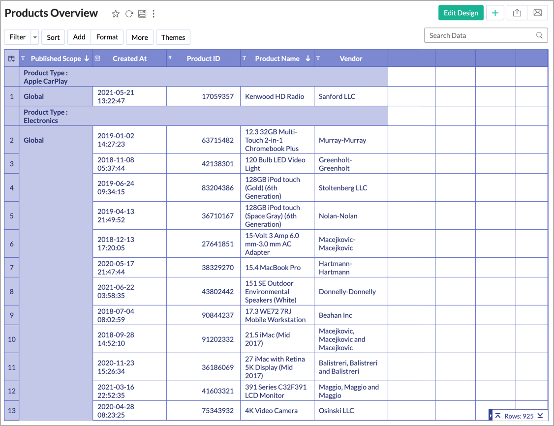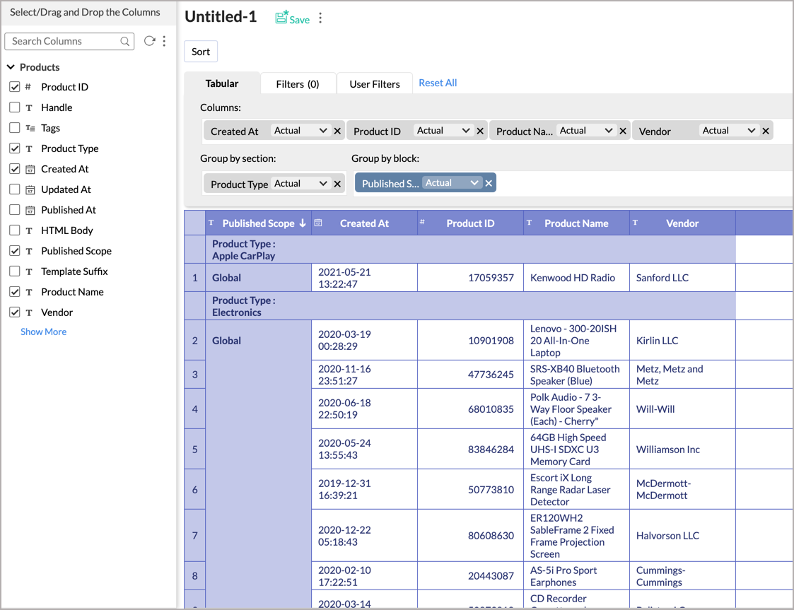 We will add further details to this table by grouping them into sections based on Product Type and blocks based on Published Scope. To do this, add Product Type to the Group by section shelf and Published Scope to the Group by block shelf and click the Click Here to Generate Report button.