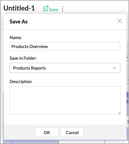 - Once you have added the required data, click the Save button in the toolbar. In the Save As dialog box that appears, type a Name and Description for the tabular view and choose the folder where the view is to be saved.