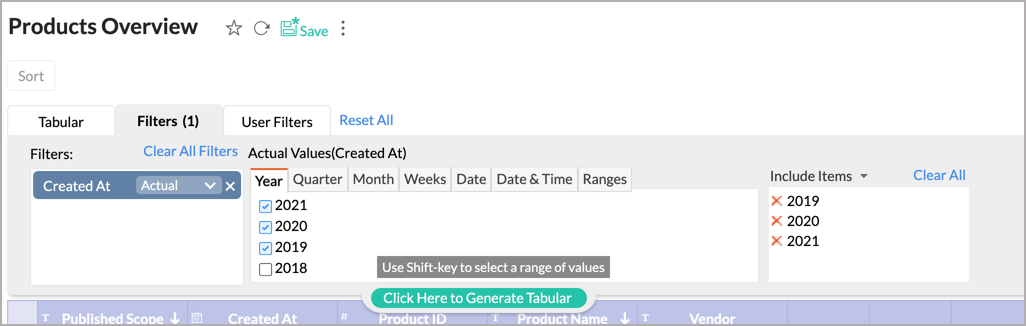 Here, we will filter the created Product Overview Tabular View to display only the data for 2019, 2020, and 2021. To do this: