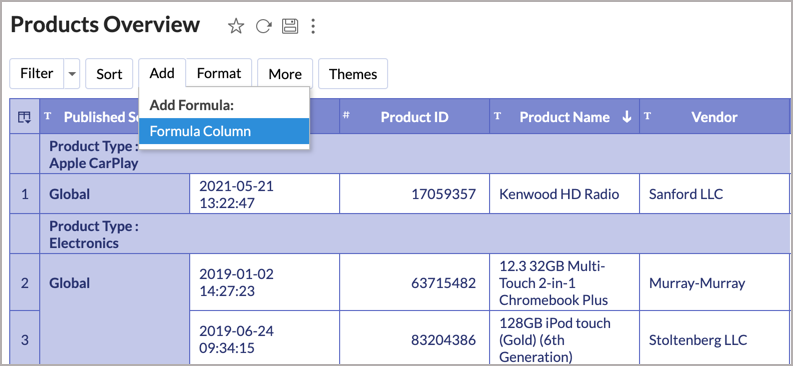 Zoho Advanced Analytics allows you to define powerful formulas and derive custom metrics to meet your specific reporting requirements. This enables you to perform from simple calculations such as addition and subtraction to a complex calculations using built-in functions. The output of the formula adds a new column in the tabular view as well as add it as formula column in the underlying data table.