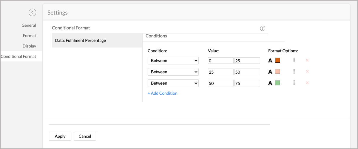Conditional formatting feature allows you to visually highlight data cells in a Summary View with different styles based on matching conditions. You have to specify the required conditions/criteria for formatting. The condition that matches first with the data cell will be applied.