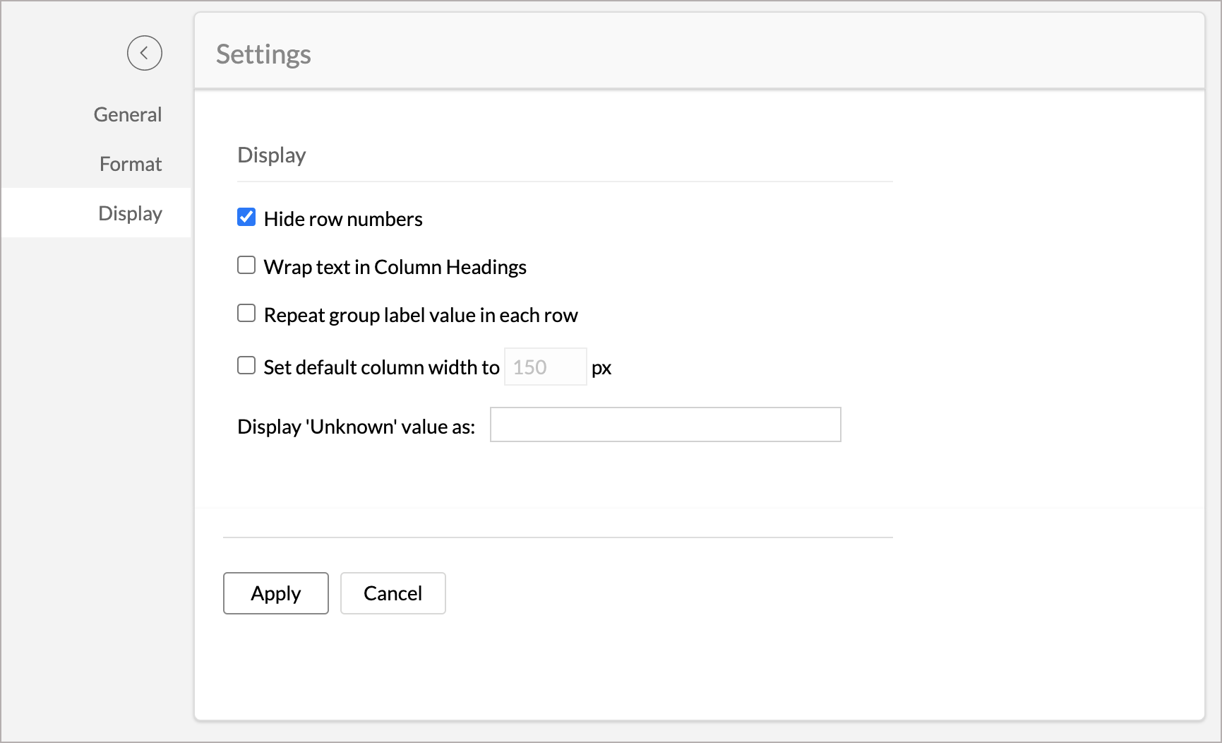 - Hide row numbers: Select this checkbox if you do not wish to display the index number for the rows. By default, this will not be selected.