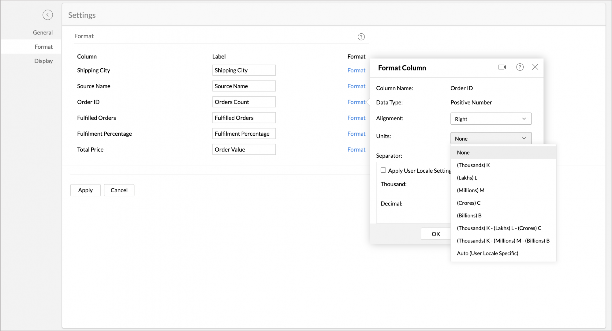 Zoho Advanced Analytics allows you to change the display labels and display format of the data columns used in your Summary View as required.