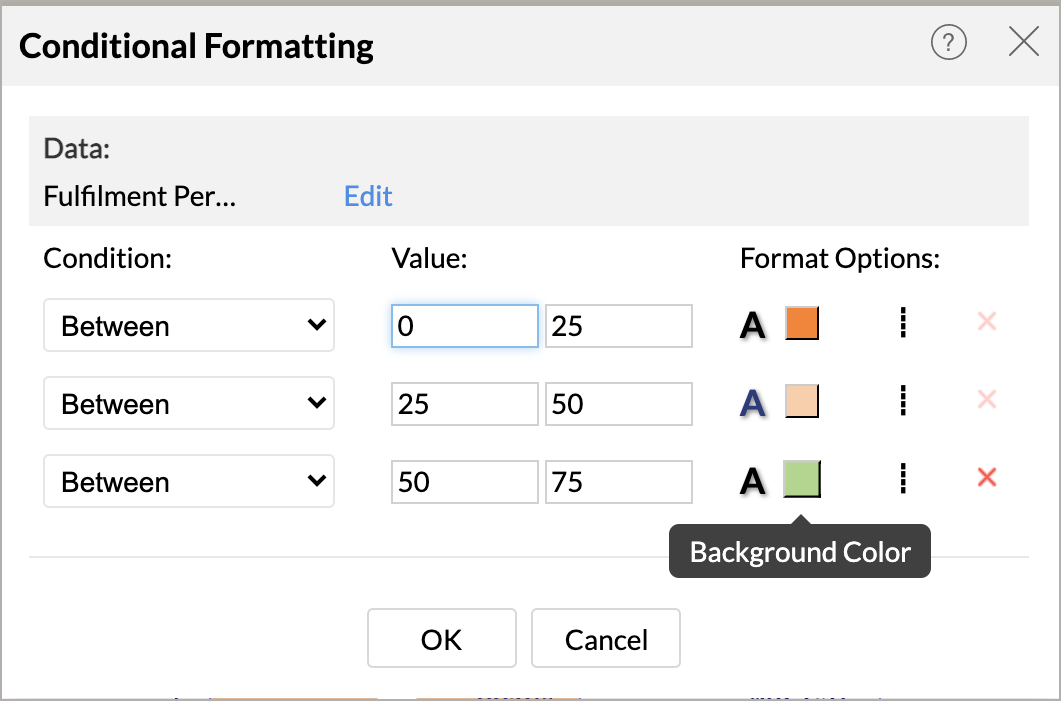 - Conditions specified will be evaluated from top to bottom and the corresponding formatting options that matches first will be applied on the data cell that meets the condition. Click OK after you have added all the conditions.
