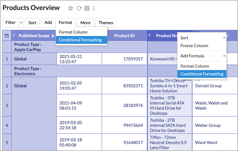- Right-click on any of the cells in the Tabular View for which you want to apply conditional formatting and click Conditional Formatting from the drop-down. Alternatively, you can click Format > Conditional Formatting from the toolbar.