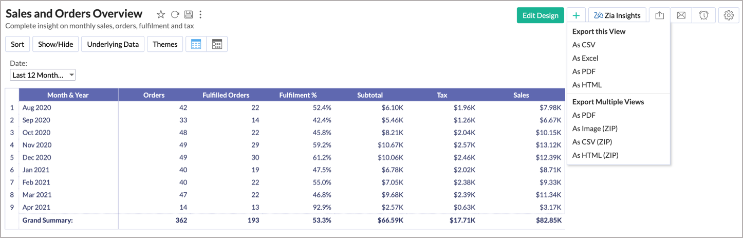 Zoho Advanced Analytics app allows you to export Pivot table that you have created into various file formats like CSV, PDF, XLS and HTML.