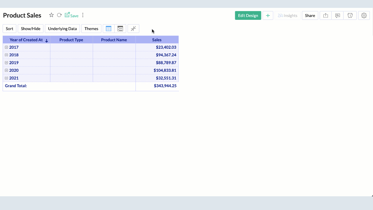 Zoho Advanced Analytics app offers a wide range of interactive options on a Pivot Table when accessed by an end-user. The options include Expand/Collapse, Viewing Underlying data, sorting, exporting, sharing and publishing a Pivot Table. In this section, we will discuss each of these options in detail.