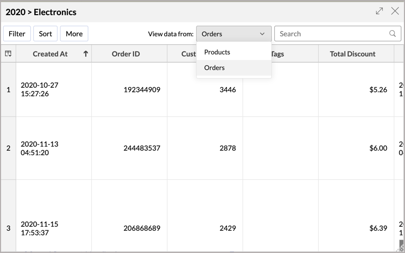 The below example shows the View Underlying Data table of a report that was created by joining the Products table and the Orders table. By default, the option Orders will be selected. This option will display the data from both Orders and Products in a single table. However, if you wish to view the data only from the Stores table you can do so by selecting Stores from the View Data From drop-down.