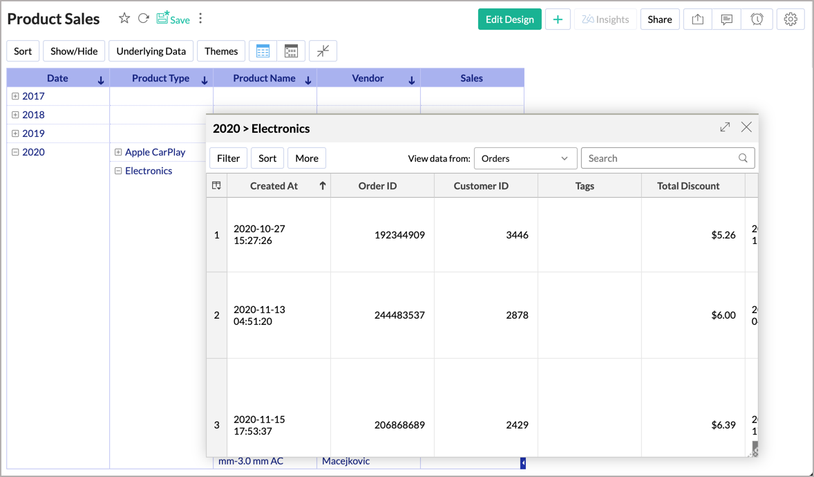 Zoho Advanced Analytics app provides an option to view (drill into) the data that makes up the Pivot Table using the option called View Underlying Data. You can click on any cell in the Pivot Table to view its underlying data in a pop-up table. Clicking your mouse over a cell in the selected Pivot Table will display its underlying data in a pop-up table. You can also view the overall data by clicking the option View Underlying Data in the toolbar.