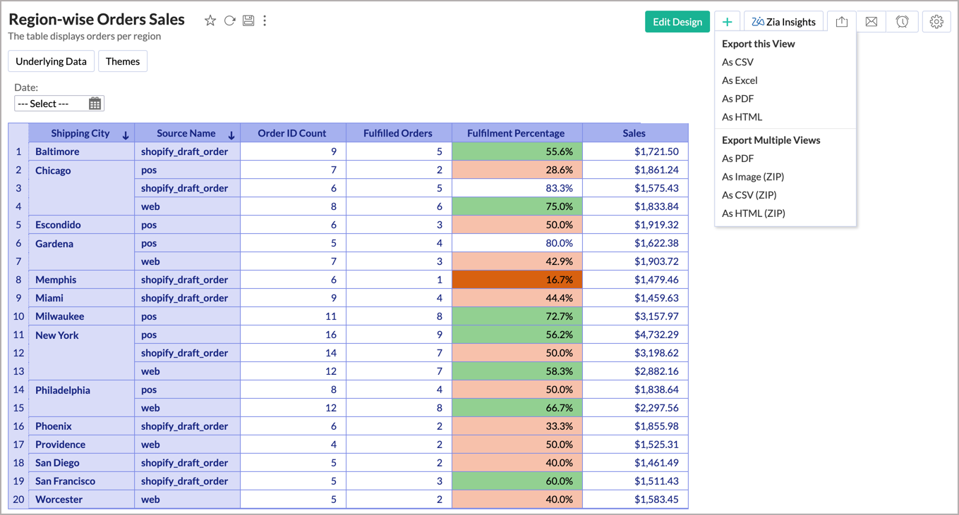 Zoho Advanced Analytics app allows you to export the summary view that you have created into various file formats like CSV, PDF, XLS, or HTML. Read more.