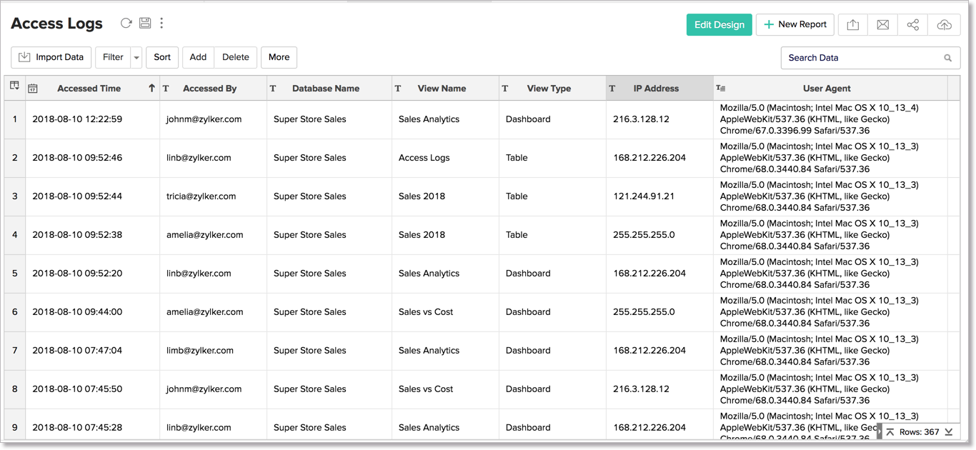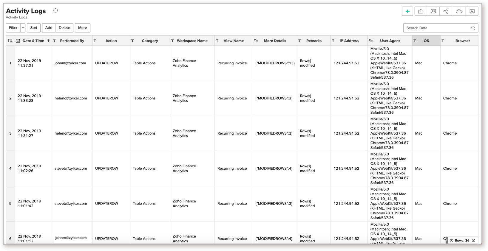 You can choose to log the users' activities or actions in your account such as importing data, creating reports, sharing reports etc. Through Activity Logs, you will know who performed these activities, when they were performed, and from where your account was accessed to perform these activities.