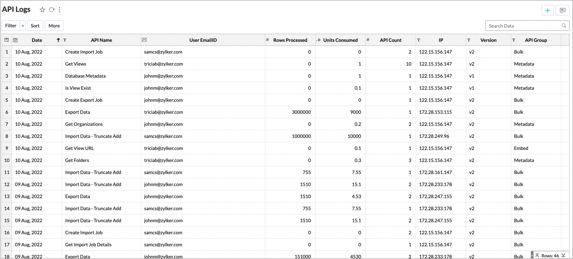Zoho Analytics allows you to track the activity of all users -- Administrators, Users, Shared Users, Viewers and Public Visitors -- in your account, through Audit Logs. You can track the following information through the Audit Logs.