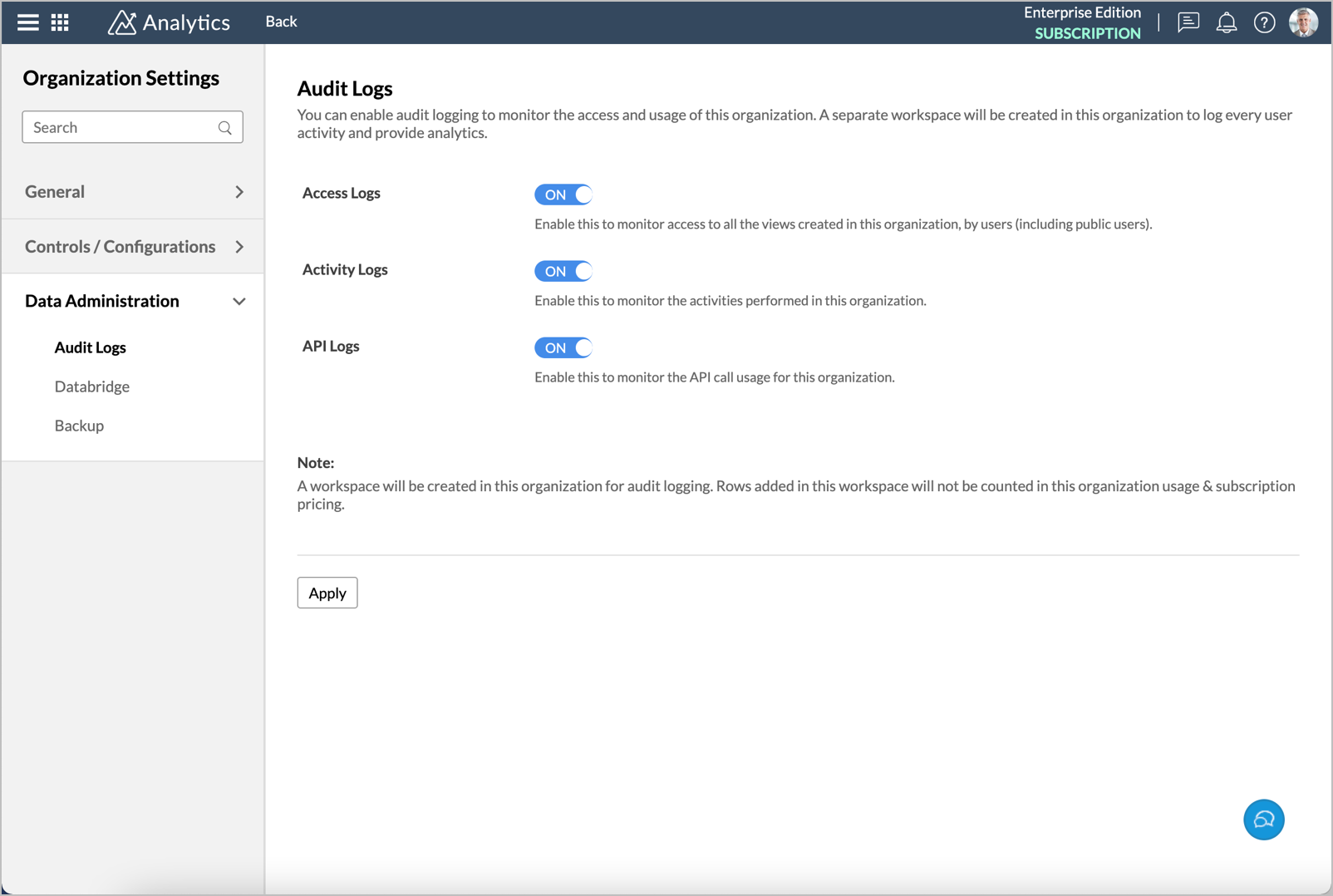 When you set up Audit Logs, a workspace named Zoho Analytics Audits will automatically be created in your account. Rows added in this workspace will not be counted in your account usage & subscription pricing.