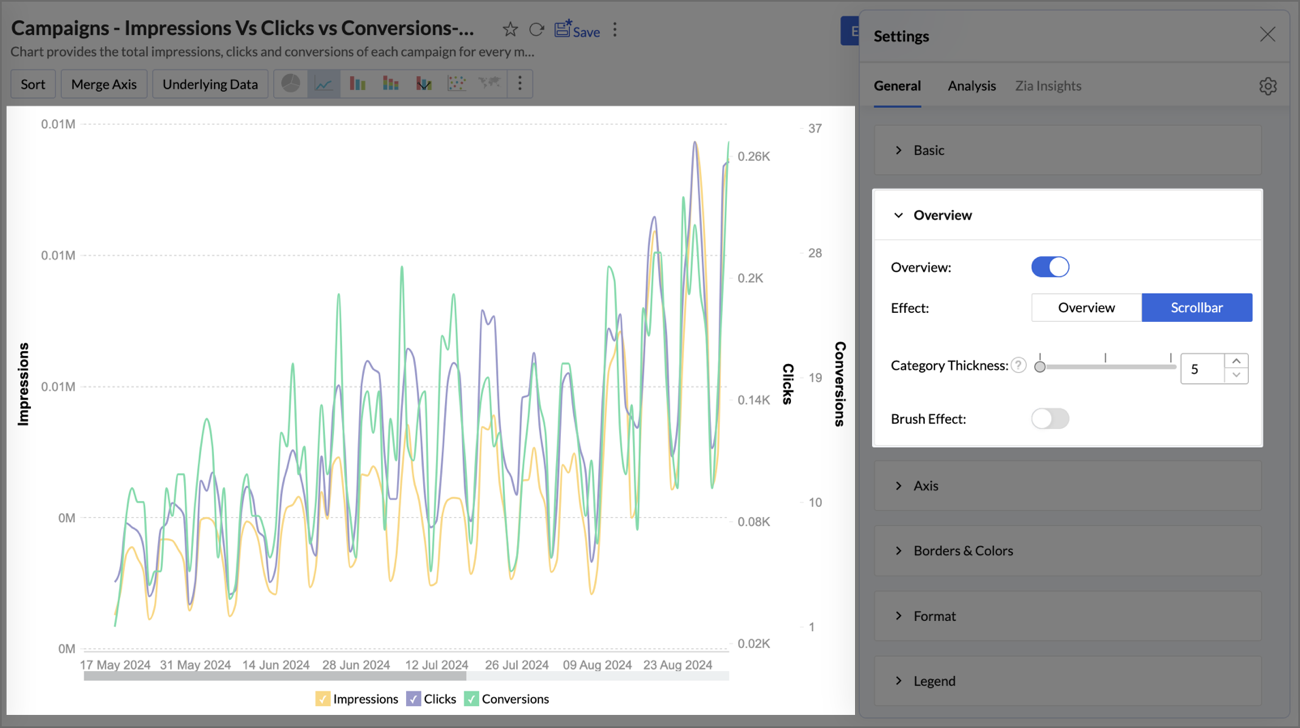 For example, take a report analyzing the Campaigns data - Impressions vs Clicks vs Conversion. To enable the overview or scrollbar effect in the above report,