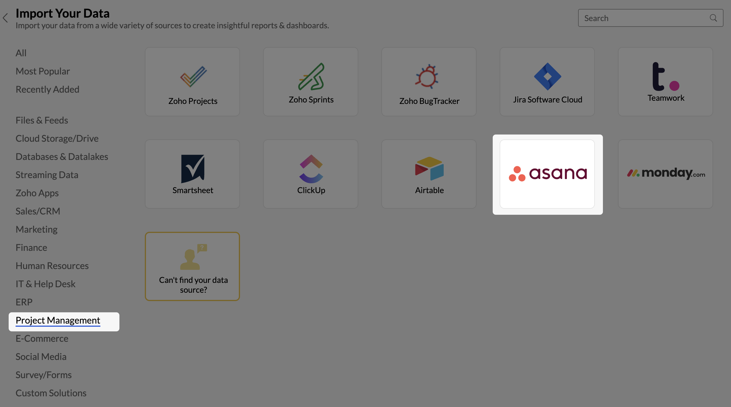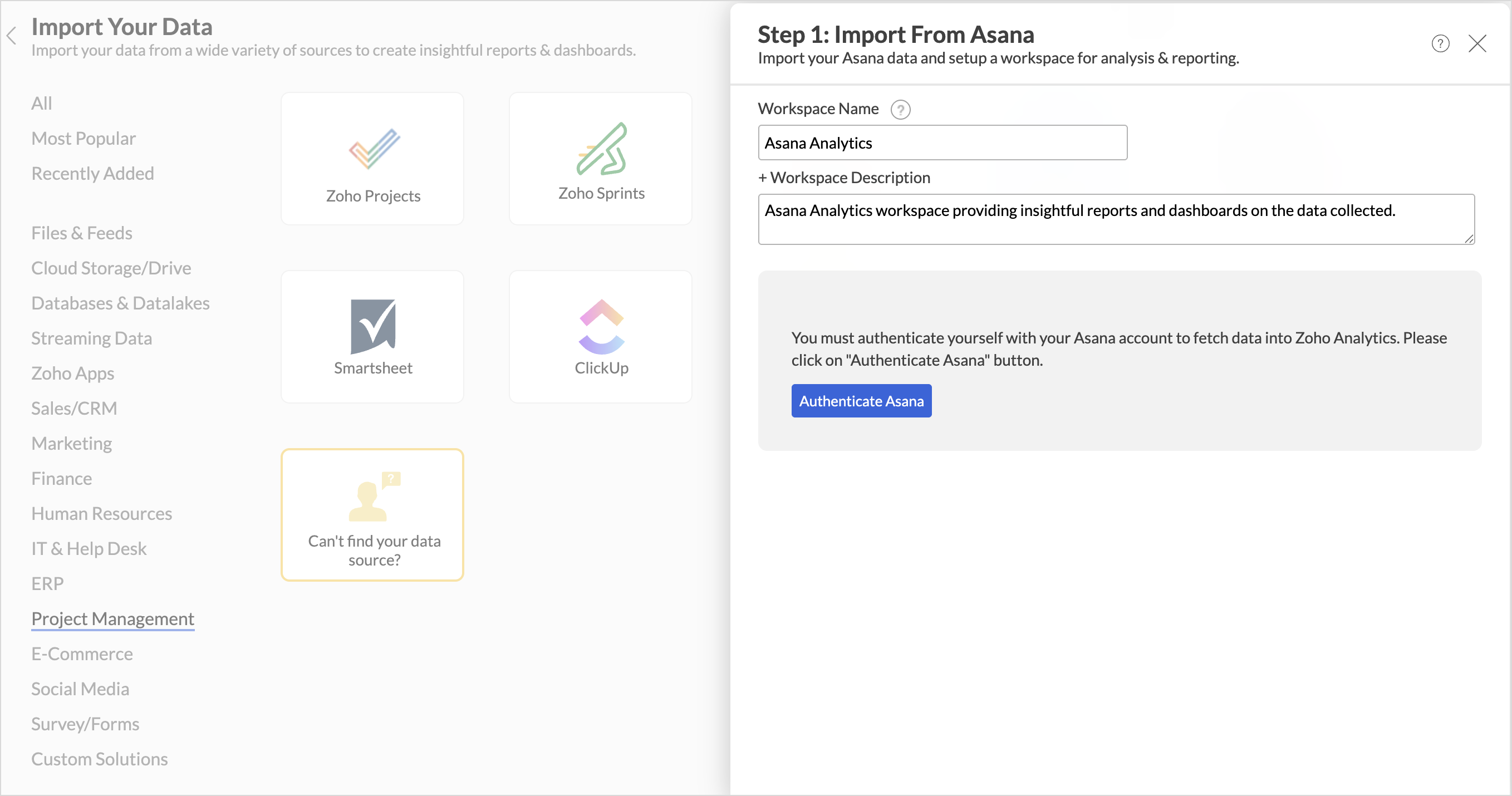 Users with Administrator Privileges can configure the connection between Asana and Zoho Analytics.