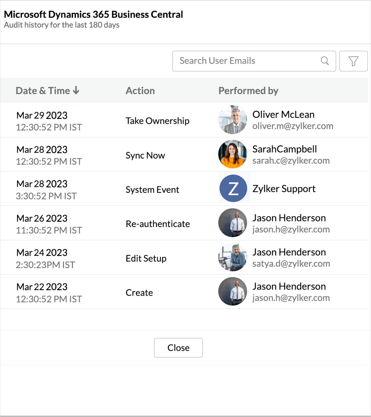 Zoho Analytics logs all the user activities and system events within the Microsoft Dynamics Business Central workspace. The following actions that are logged in Zoho Analytics,