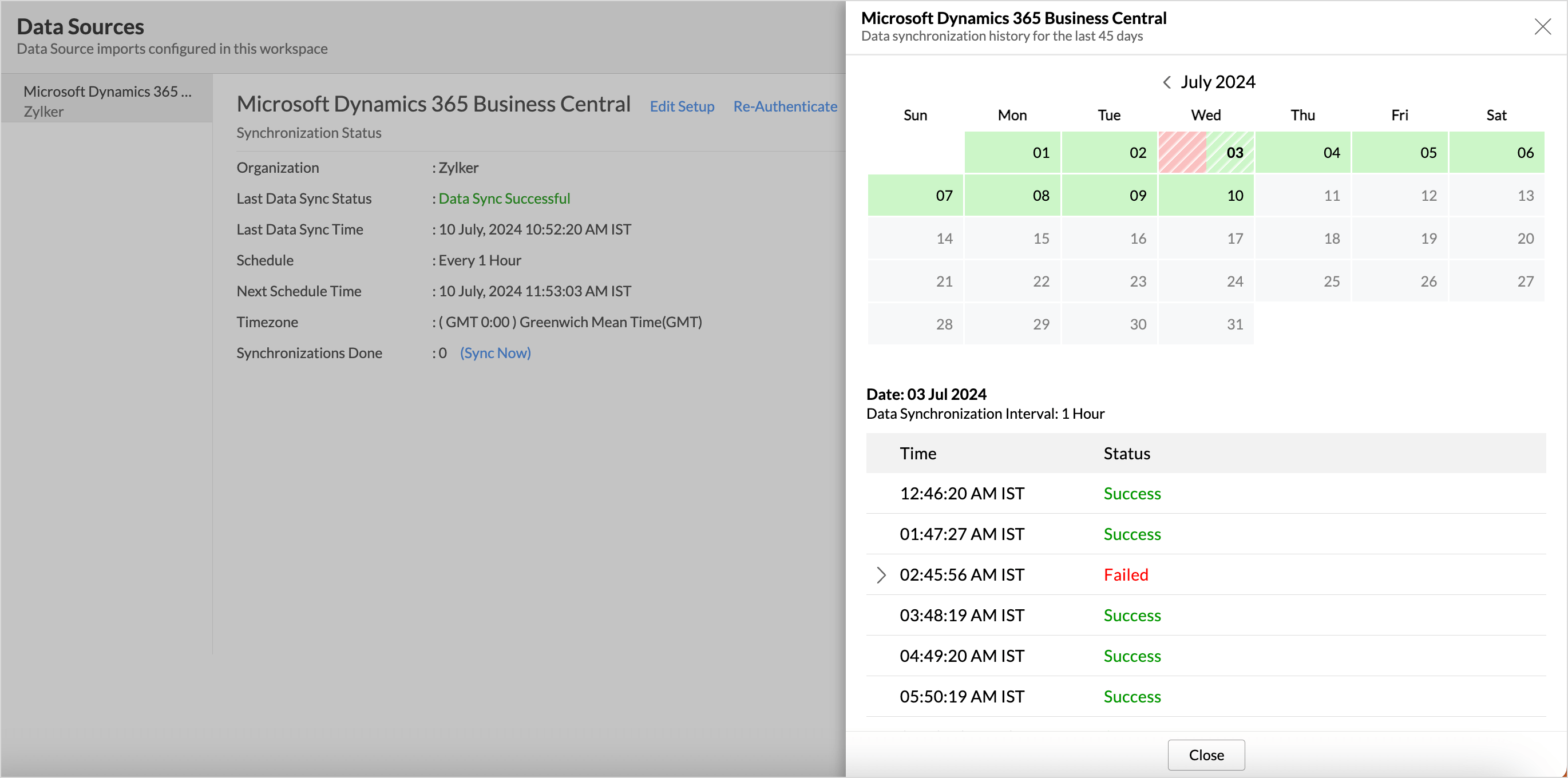The Sync History tab provides details about the data sync for the last 45 days. A successful data sync is marked in green, and a sync failure is marked in red.