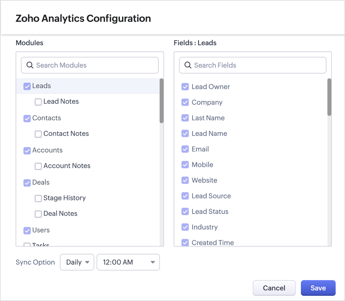 - From Zoho Analytics Configuration dialog, select the modules and fields to sync. Mandatory fields are preselected and cannot be cleared.