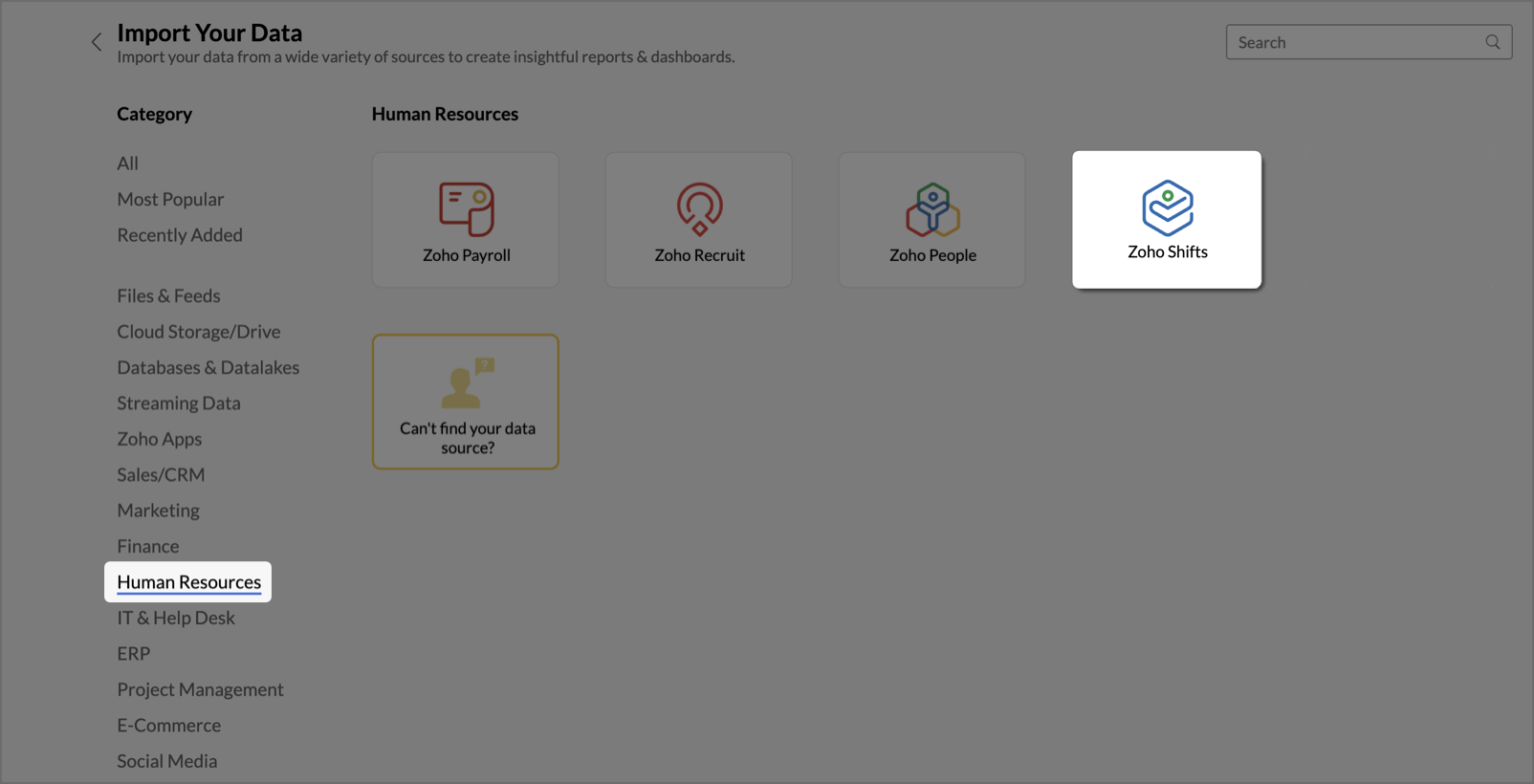 - Navigate to the Zoho Apps tab and select Zoho Shifts from the available data sources.