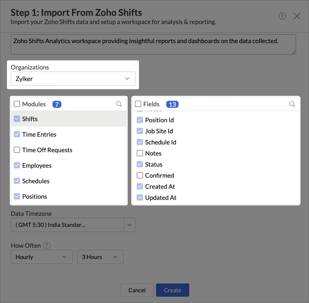 - The Step 1: Import from Zoho Shifts dialog will appear.