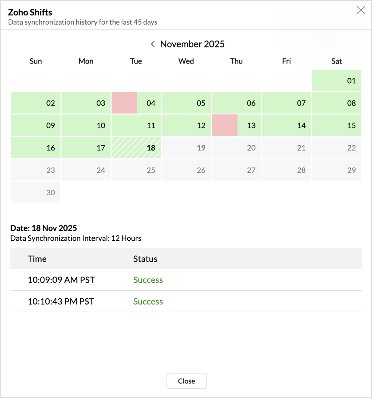 - A calendar with the Sync History of the last 45 days will open. The date when the data sync has happened will be highlighted. Hover to view the number of times the data had got synced on a specific date.