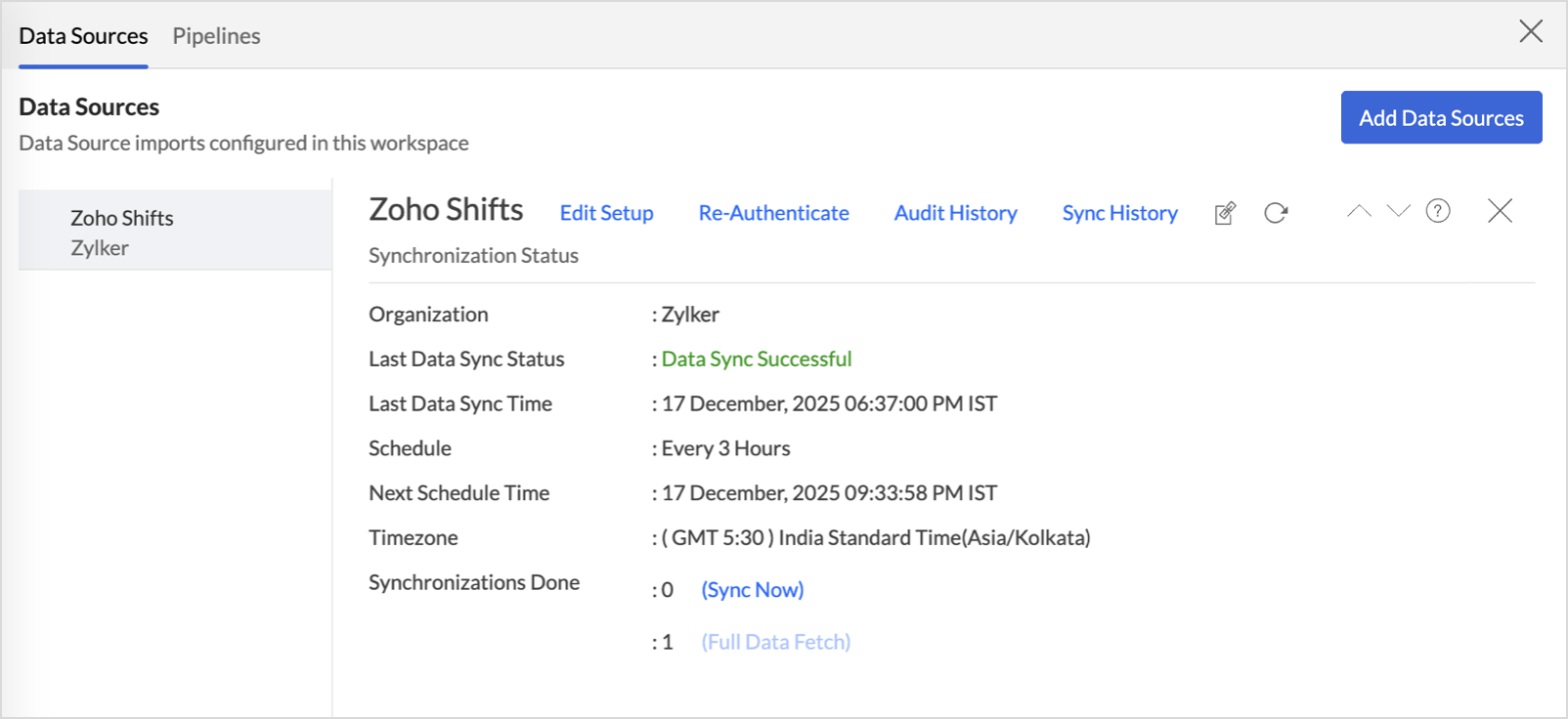 - The Full Data Fetch option can be used to sync all the changes made in the Zoho Shifts application, like datatype changes, or to resolve temporary sync issues.