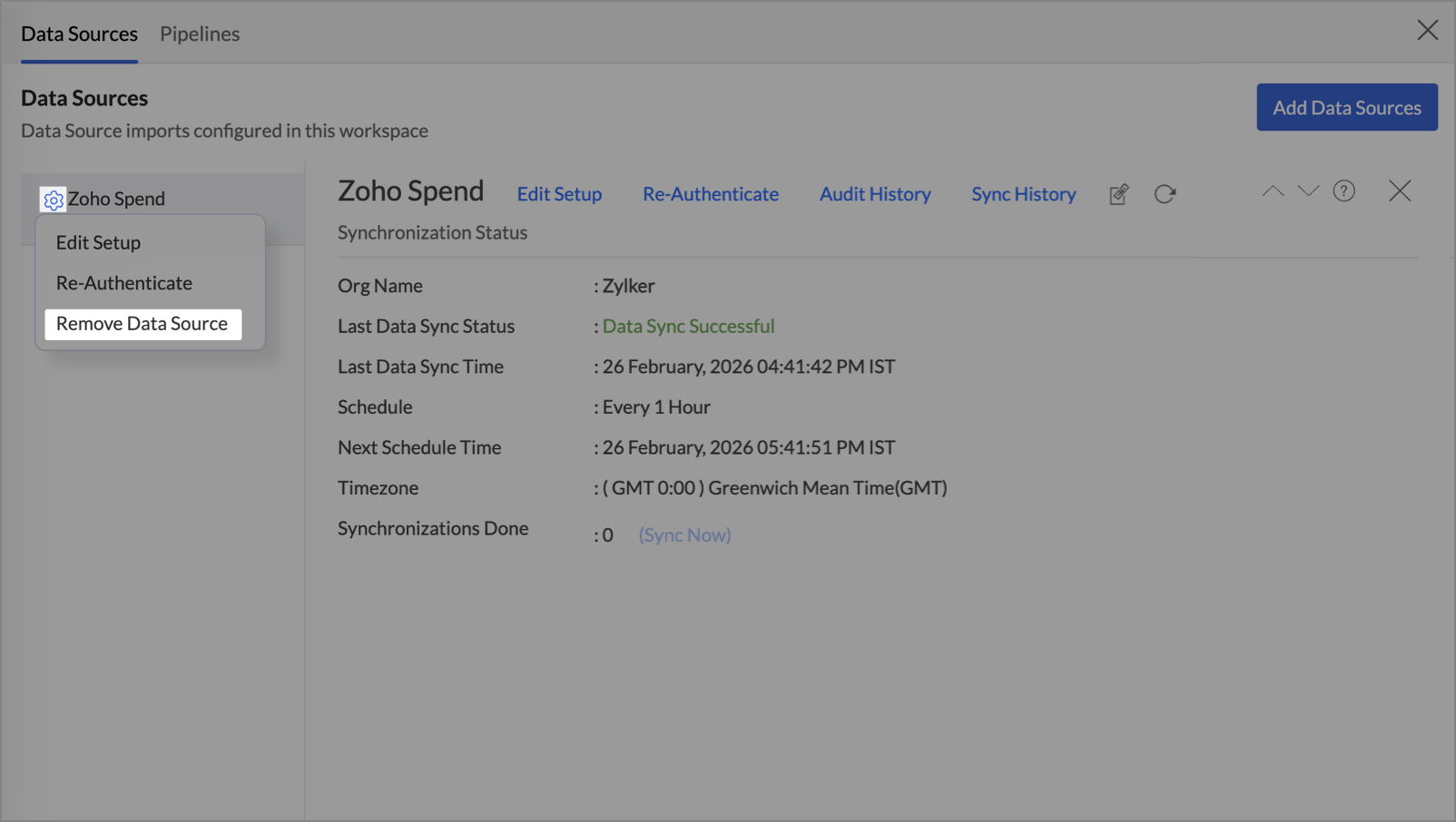 Click Data Sources > Re-Authenticate. The Re-Authenticate Zoho Spend dialog will open. Click Authenticate Zoho Spend and enter the Zoho Spend credentials to re-authenticate.