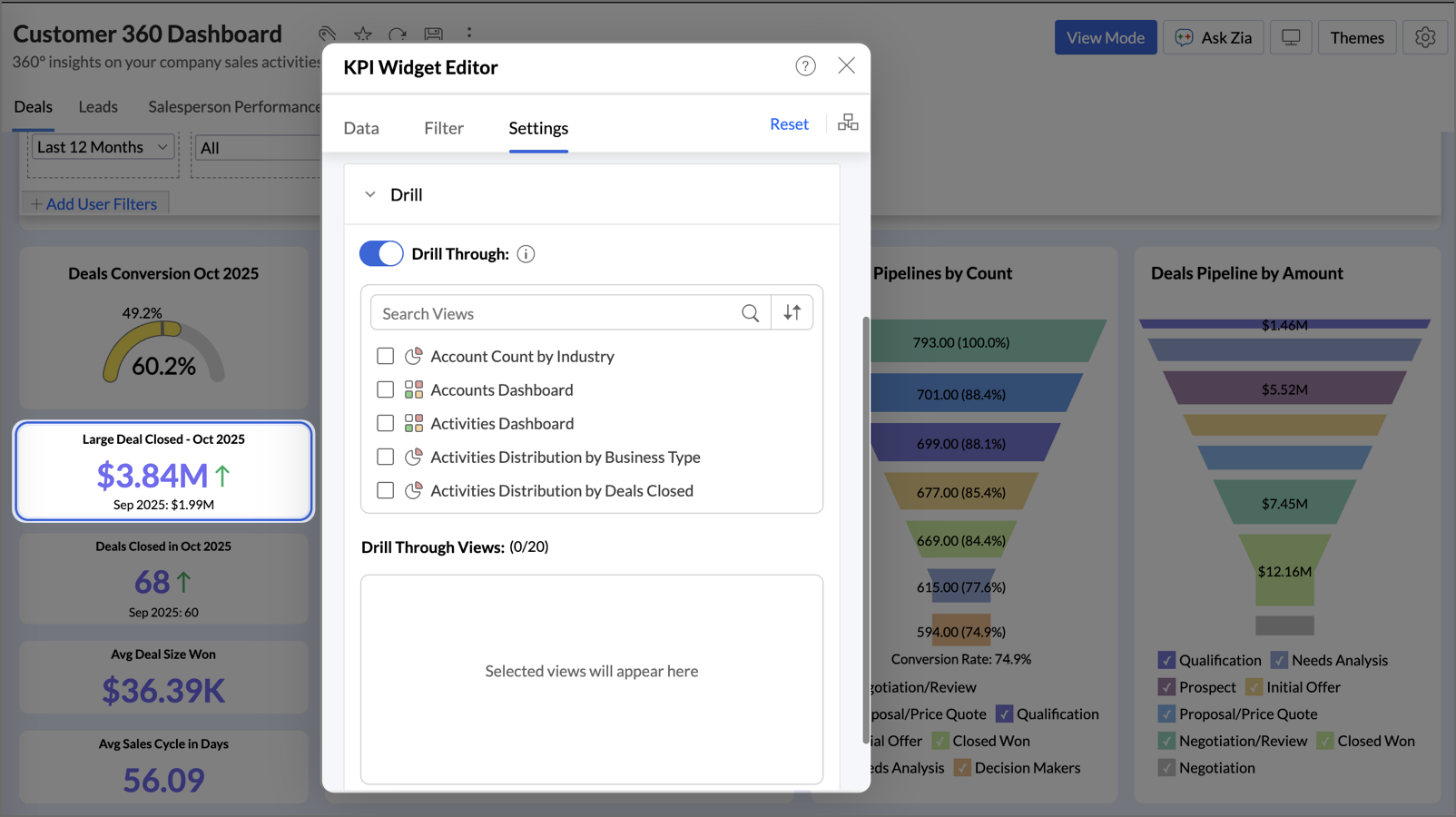 Zoho Analytics allows you to link widgets to related reports or dashboards, enabling users to drill through for deeper insights. This is achieved by enabling the Drill Through option and configuring the target reports or dashboards.