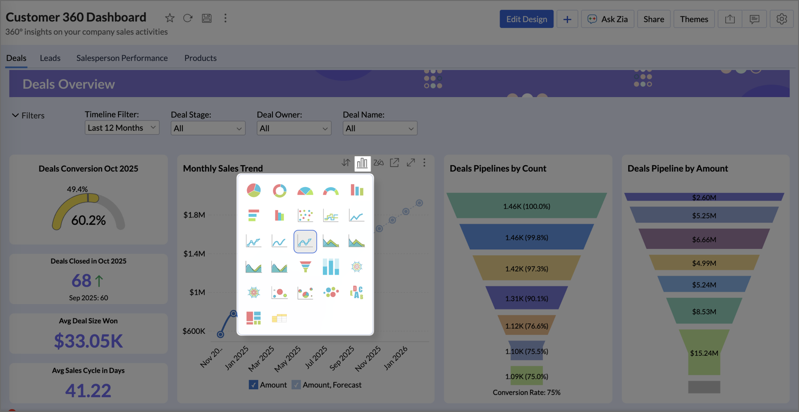 Zoho Analytics allows you to visualize the chart that you have created using different chart type options. You can change the chart type of individual charts in a dashboard by clicking the Change Chart Type option. Please do note this is applicable only for a particular session and cannot be saved.