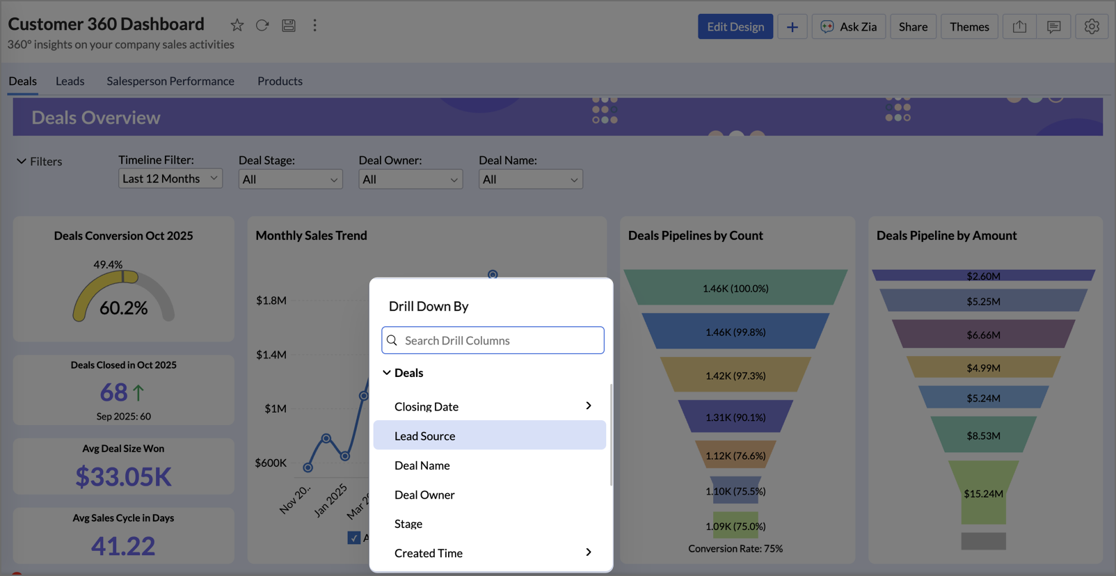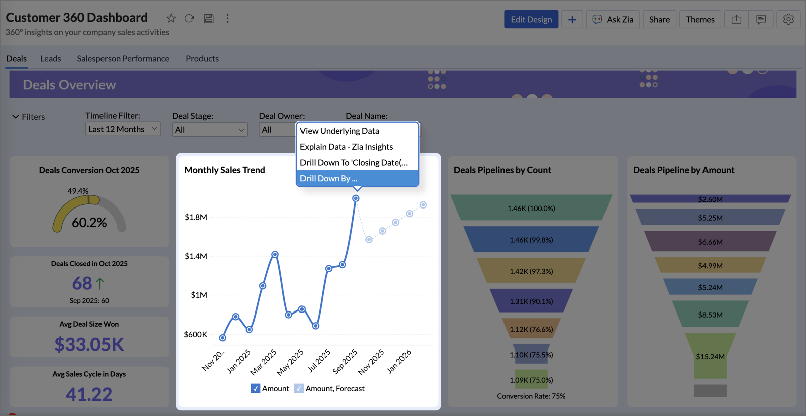 - Zoho Analytics offers two options to drill down - Drill Down and Drill Down By.