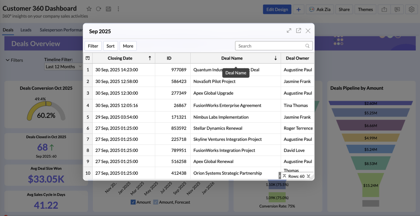 Zoho Analytics offers a wide range of interactive options for dashboards when accessed by an end-user. The options include Viewing Underlying data, sorting, exporting, sharing and publishing. In this section, we will discuss each of the below-mentioned options in detail.