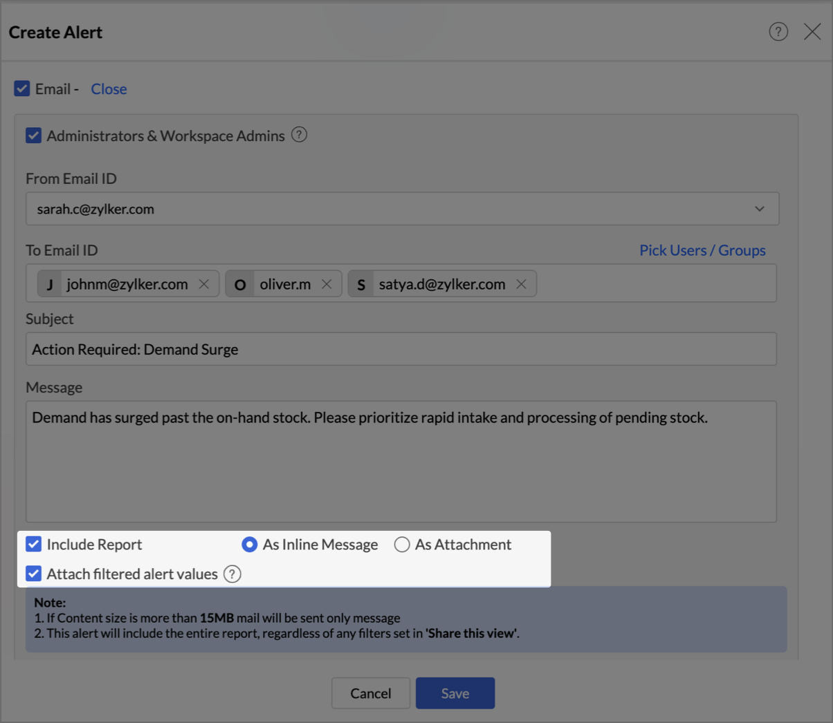 Note: If the total email content exceeds 15 MB, the email will be sent with the message only — without the report.