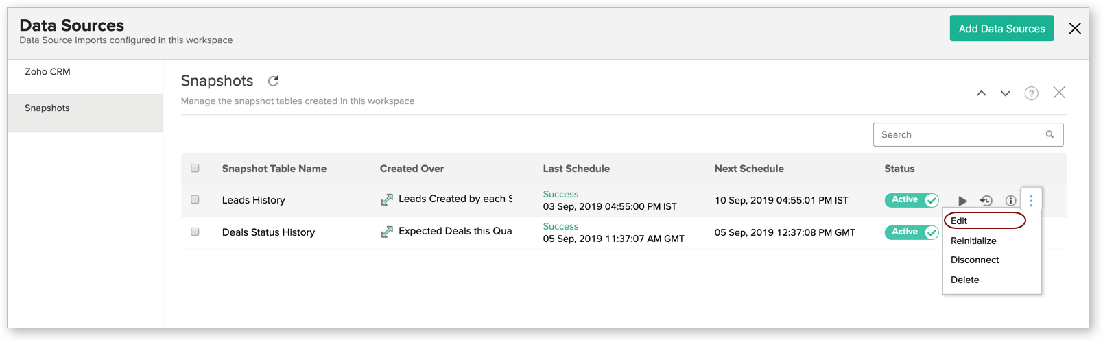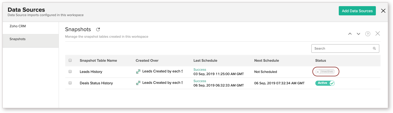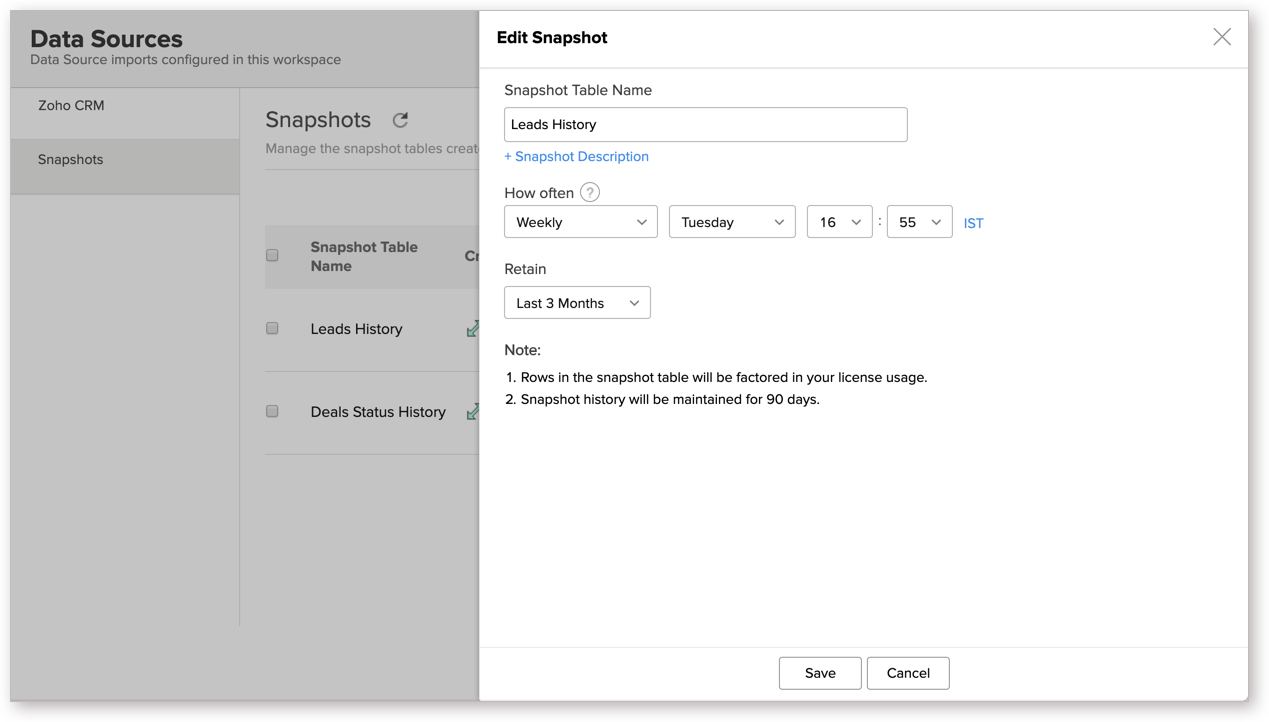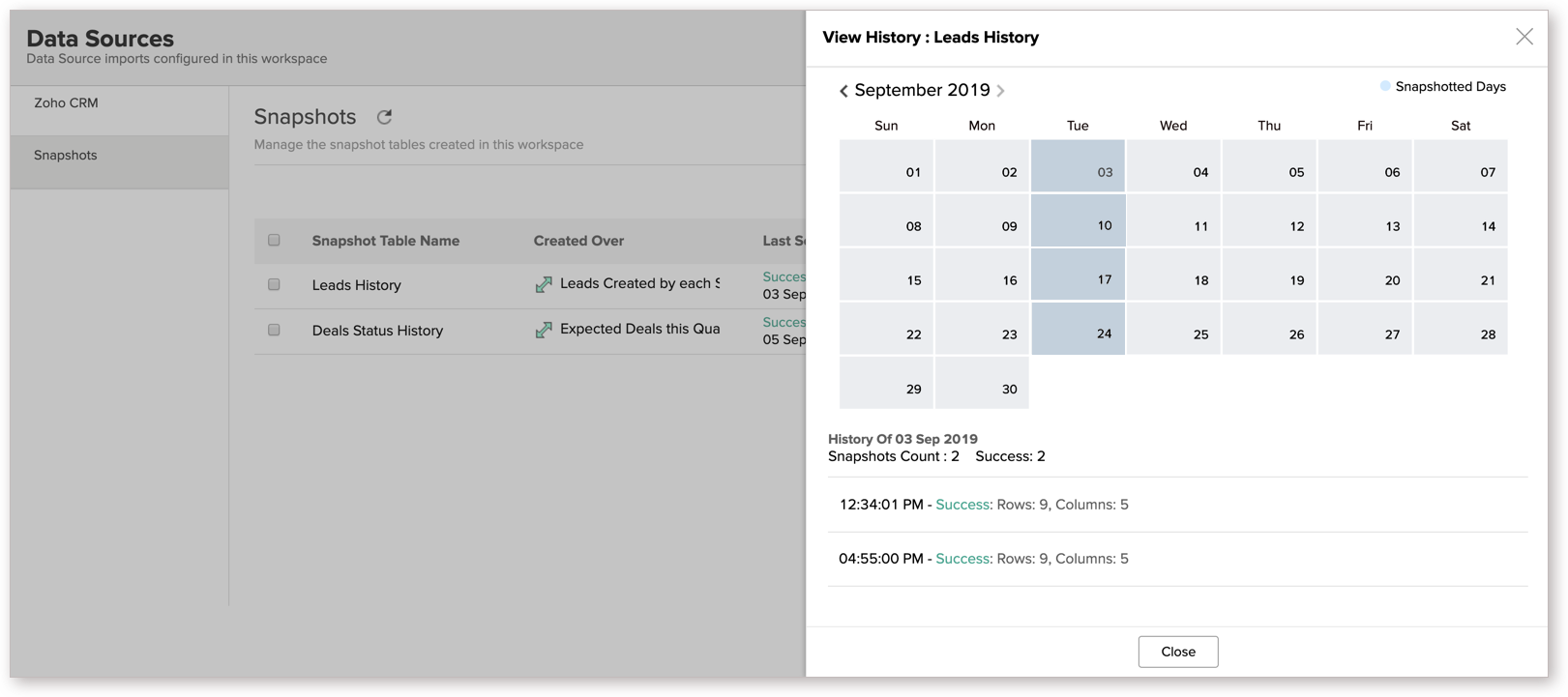 Data Snapshot allows you to capture and maintain historical data from a report. It periodically snapshots the data from a chosen report, and stores them in a table for historical report creation & analysis. Let's say you have a report for Leads by Source and Status. With Data Snapshot, you can track the change in leads status across the time span like every month, week, day or hour.