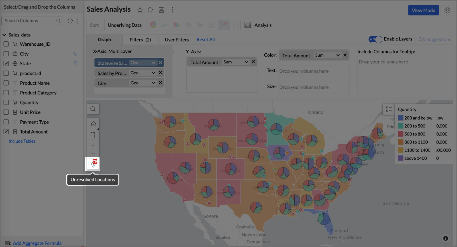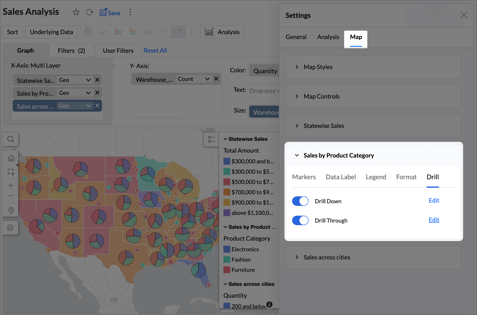 For example, if you have a layer showing Total Sales by State and another showing Product Category Sales by State, you can configure a drill-through to a City-wise Sales report. This helps you see which cities perform best and which product categories lead in that region.
