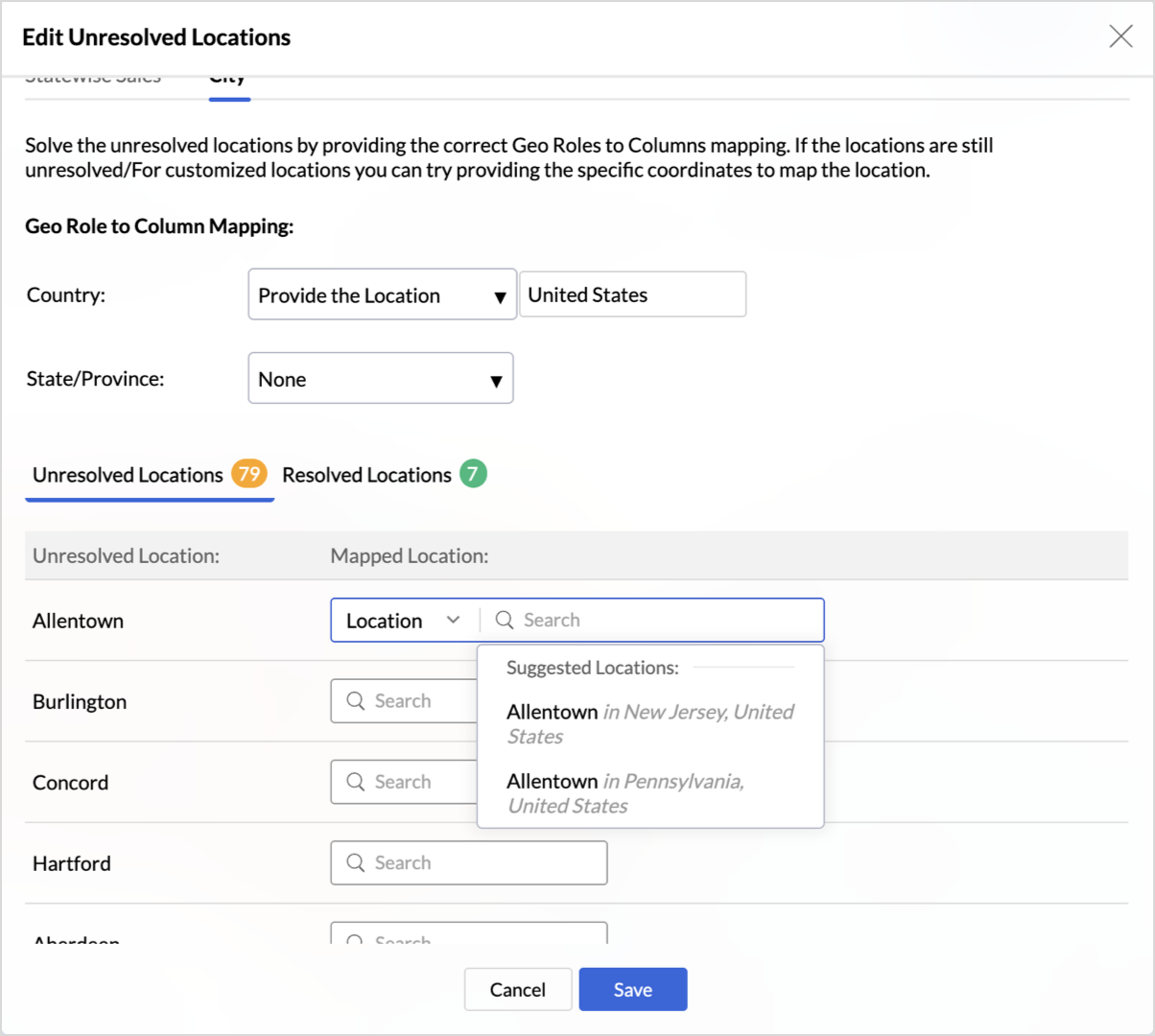 - This dialog will list all locations that the system could not automatically plot on the map. From here, you can review the details and resolve them by manually correcting the location data or assigning coordinates.