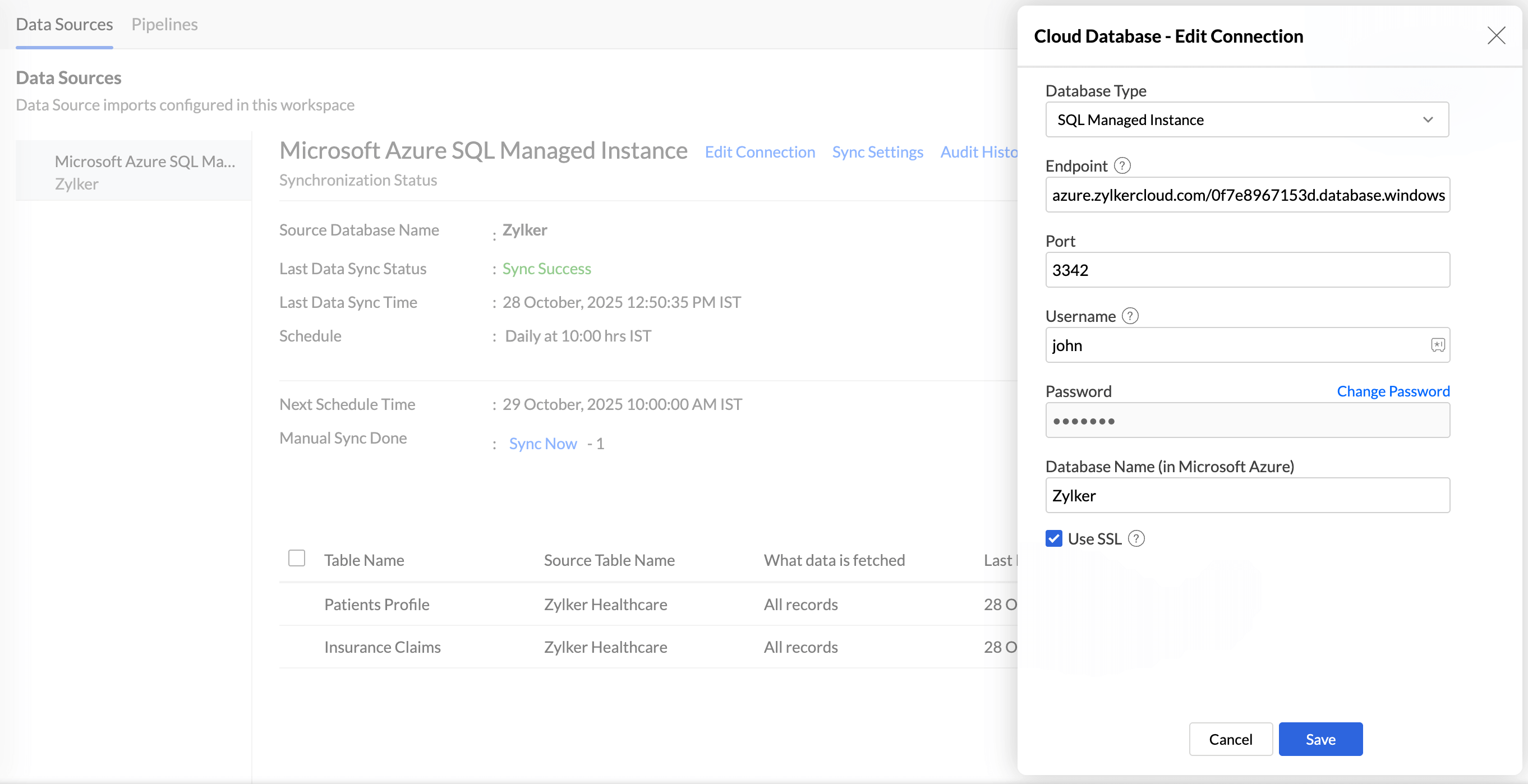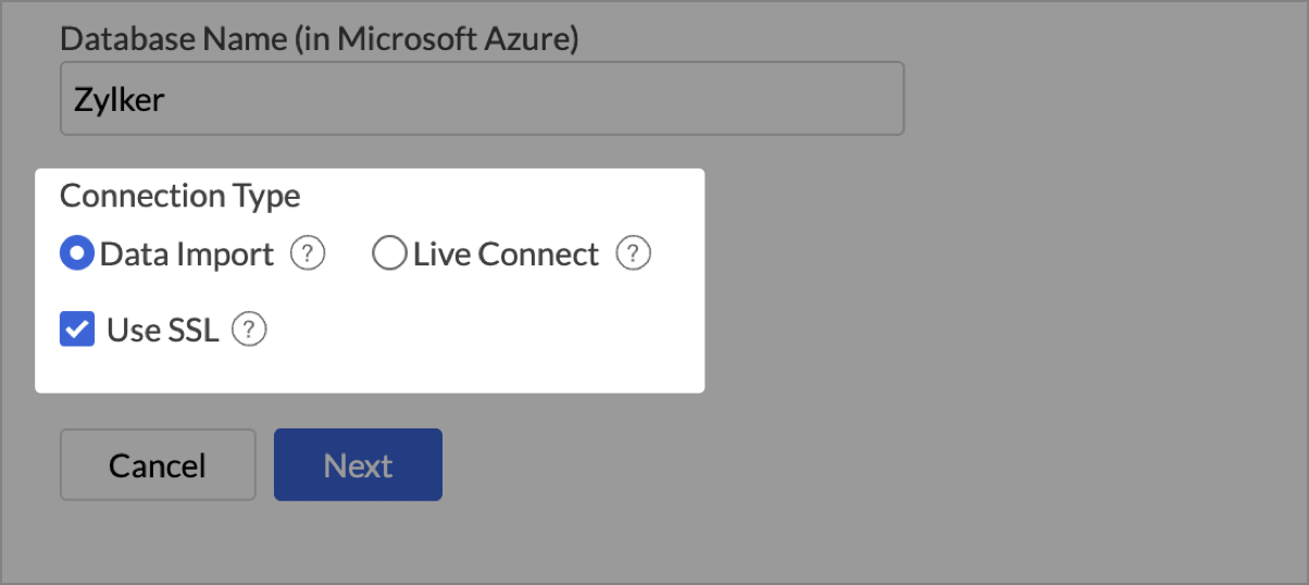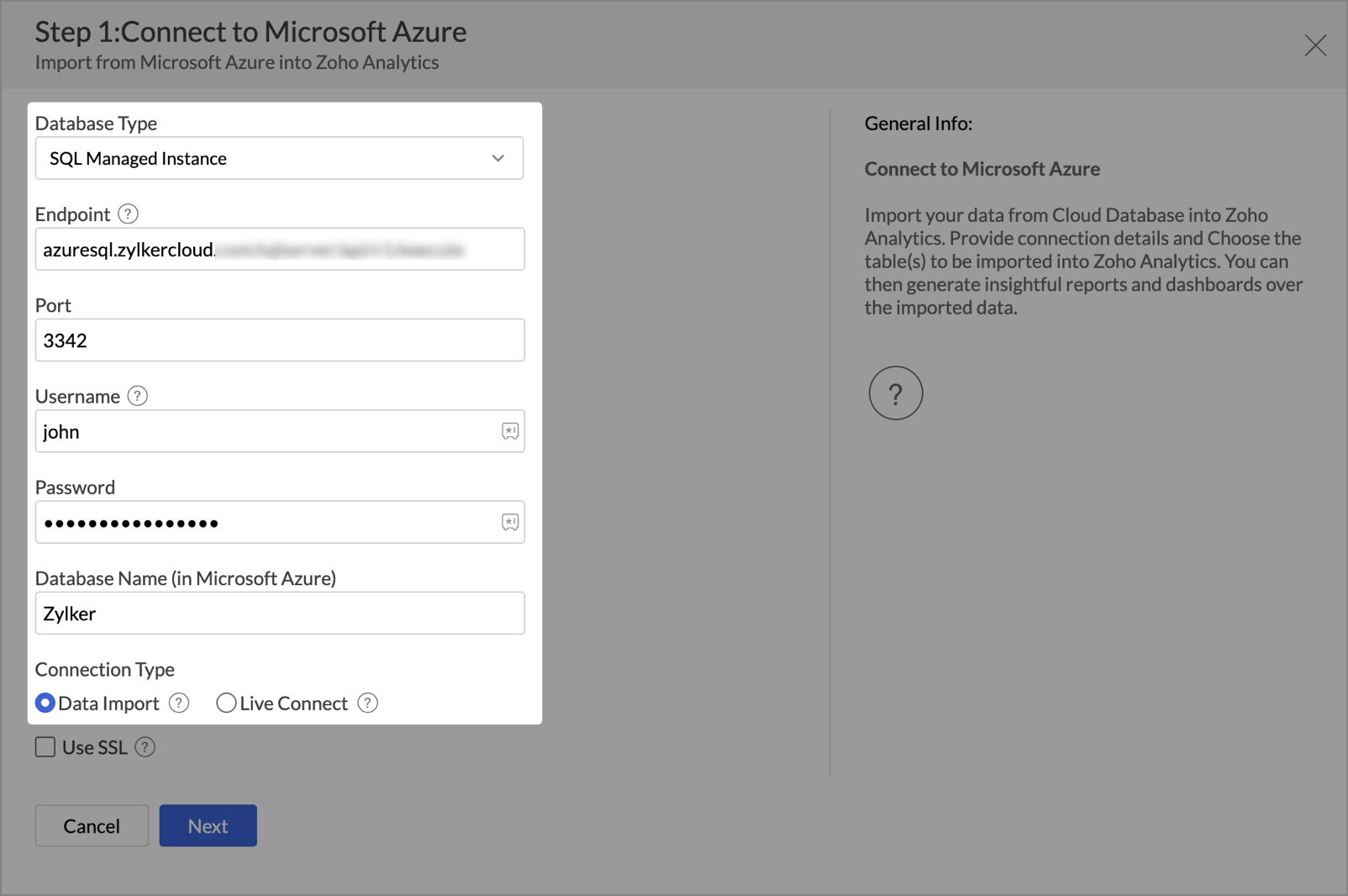 - Select the checkbox Use SSL to secure data transmission between Azure Managed Instance and Zoho Analytics.