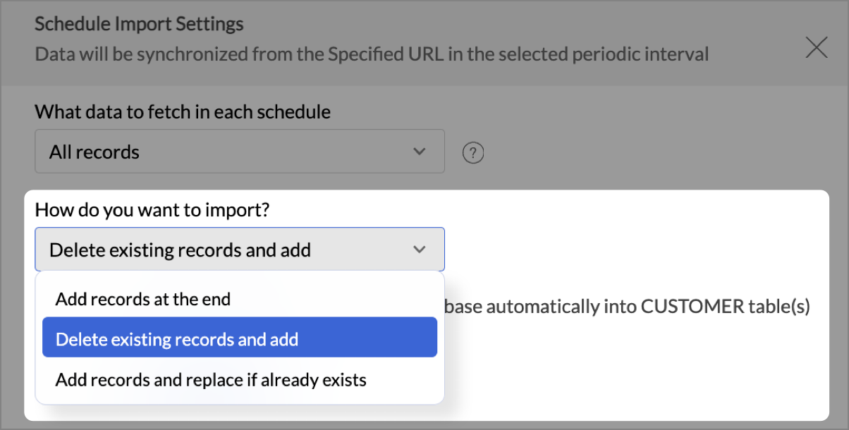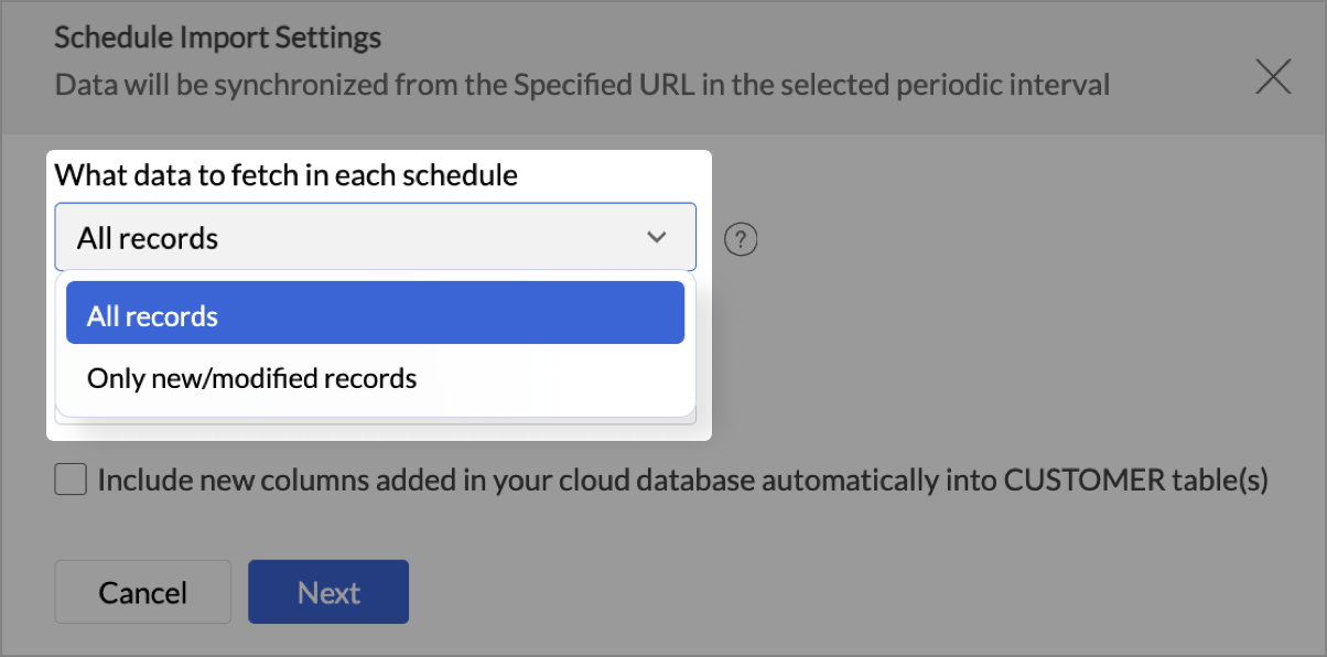 - Choose What data to fetch in each schedule drop-down menu. You can choose to import all the records or incrementally fetch only the newly added or modified records.