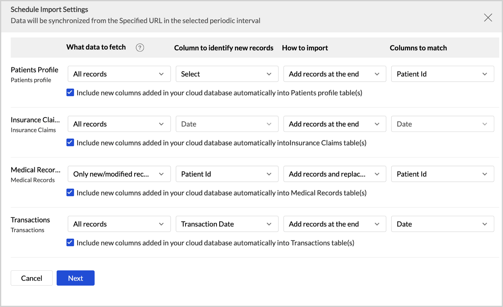 - Select Include new columns added in your cloud database automatically into Zoho Analytics table(s) to import data from newly created columns in the subsequent imports.