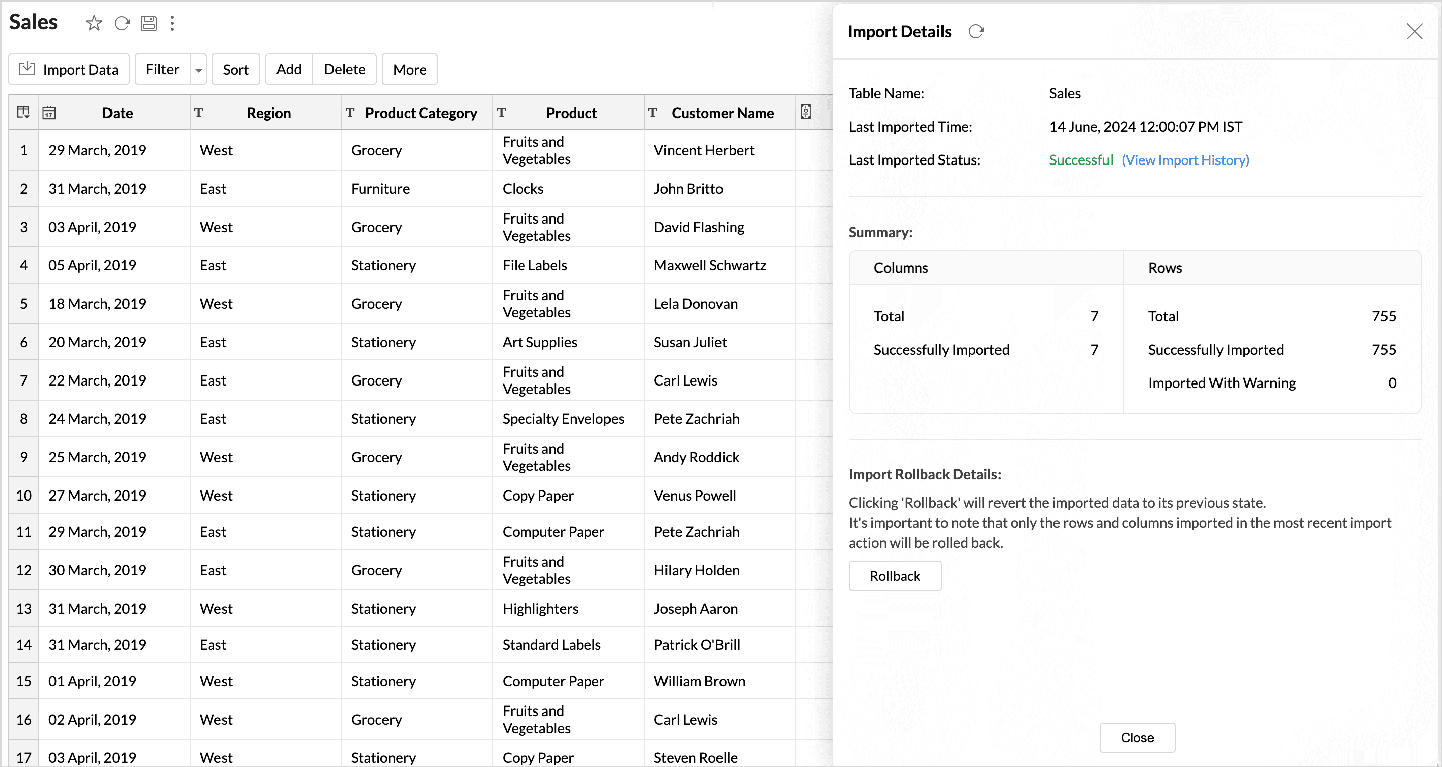 Import rollback reverts the most recent data import to the previous version. Users with administrator privileges and custom role users with permission to create tables can perform this action. Rollback facilitates the correction of errors in data without disrupting operations and also minimizes data loss. It is useful in collaborative environments where multiple users access the data and make changes.
