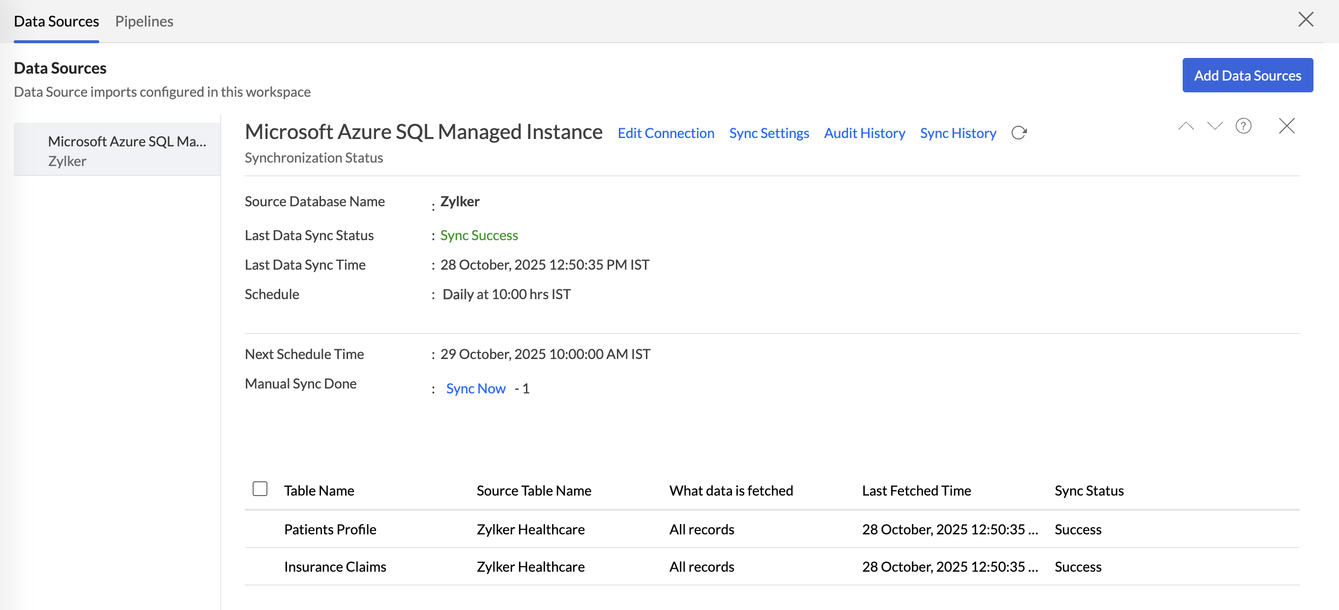 The Data Sources tab is the central hub that helps manage all the connection settings of the data sources in the workspace. It also helps keep tabs on the data sync status and notifies in the case of data sync failures. Users with the Administrator Privilege can access the Data Sources tab and make necessary changes when needed.