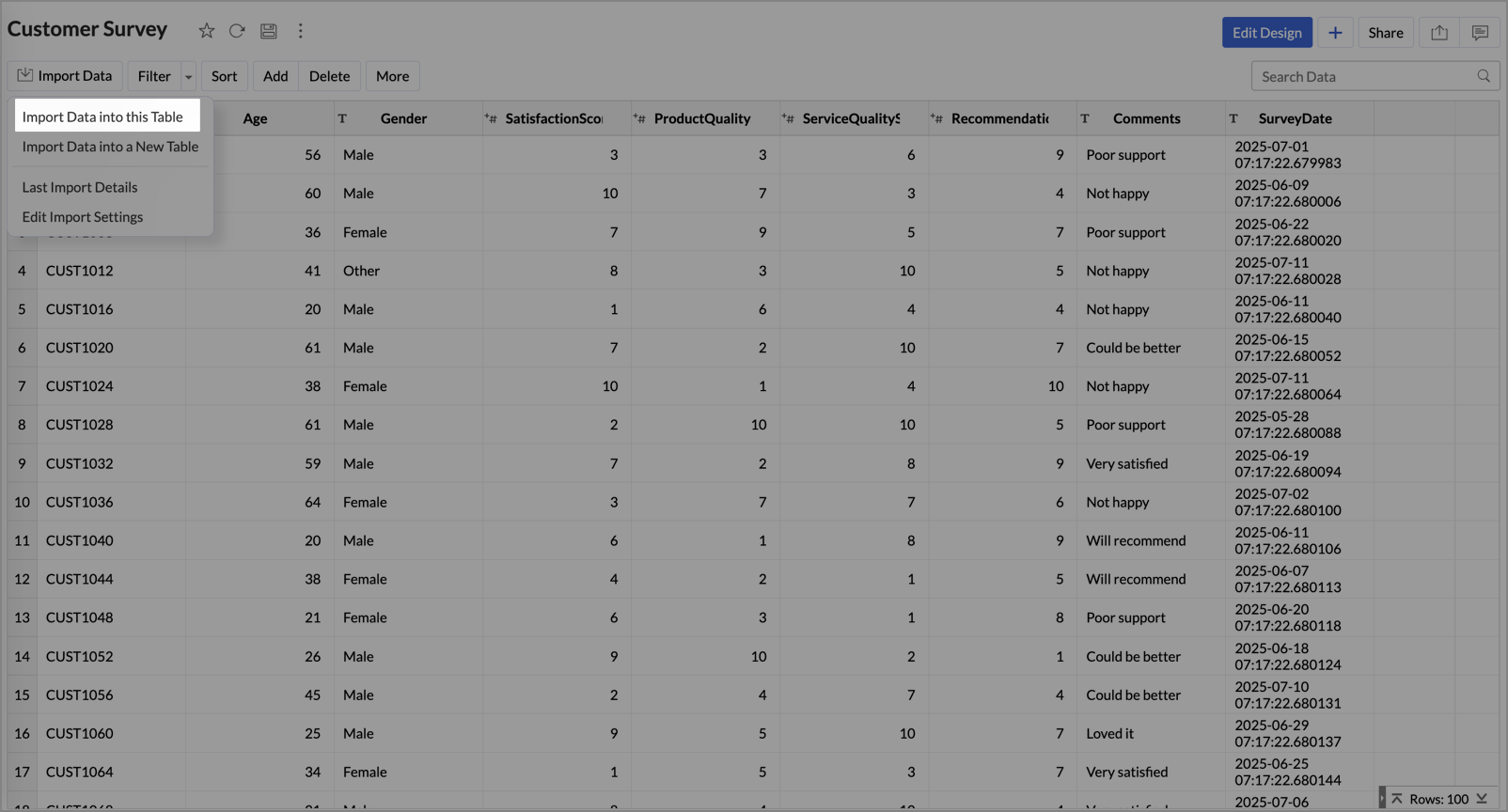 - Click Import > Import data into this Table.