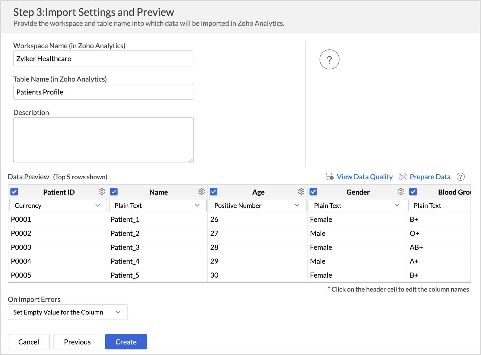 - In the Import Settings page that opens, specify the Workspace Name that is to be created in Zoho Analytics. You can also provide a Description about the workspace.