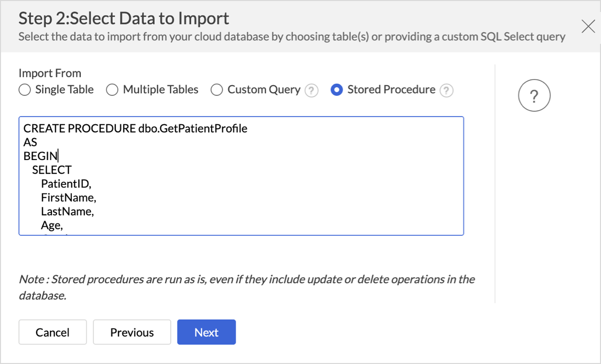 A stored procedure is a pre-defined SQL program that runs one or more SQL statements on your database. In Zoho Analytics, you can import the result set of a stored procedure, as a table for analysis.