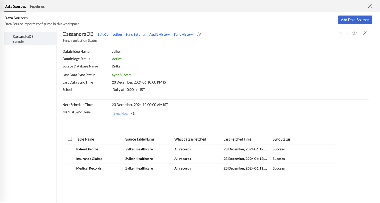 The Data Sources tab is the central hub that helps manage all the connection settings of the data sources in the workspace. It also helps keep tabs on the data sync status and notifies in the case of data sync failures. User with the Administrator Privilege can access the data sources tab and make necessary changes when needed.