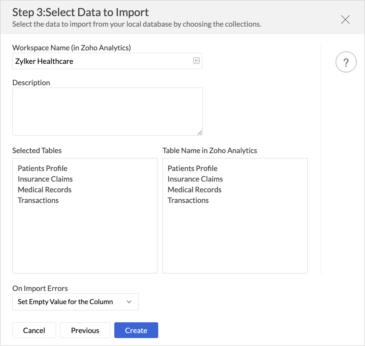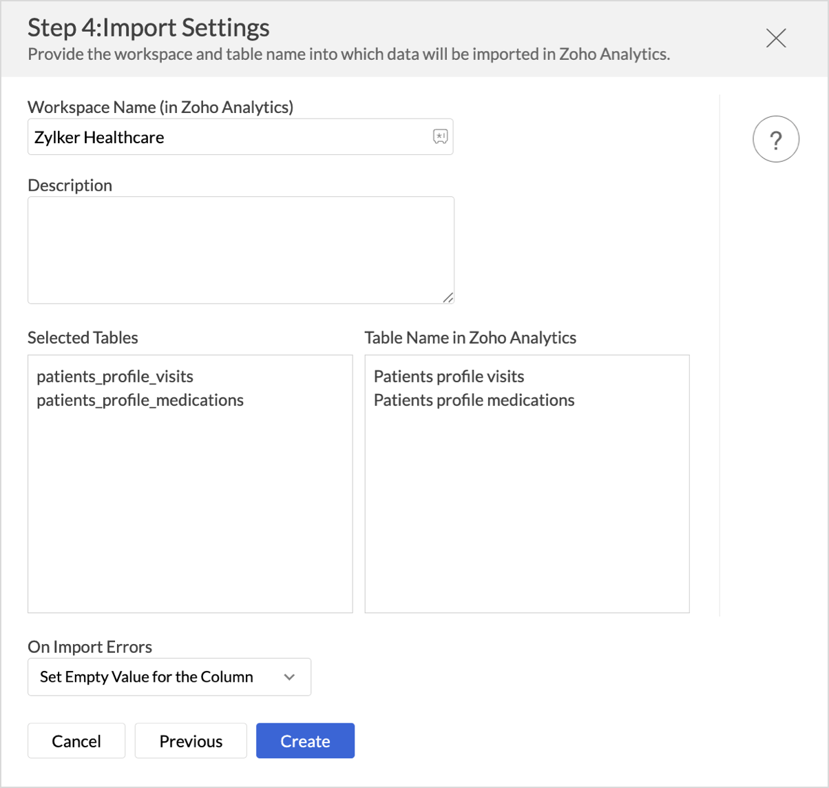 - In the Import Settings page that opens, specify the Workspace Name that is to be created in Zoho Analytics. You can also provide a Description about the workspace.