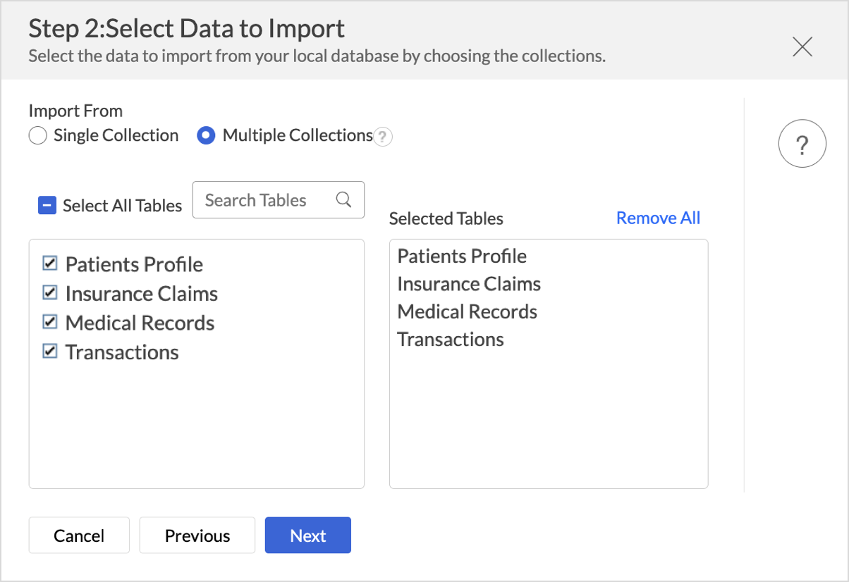 - If you select Multiple collections, only the parent tables from each collection will be imported. Child tables will not be included.