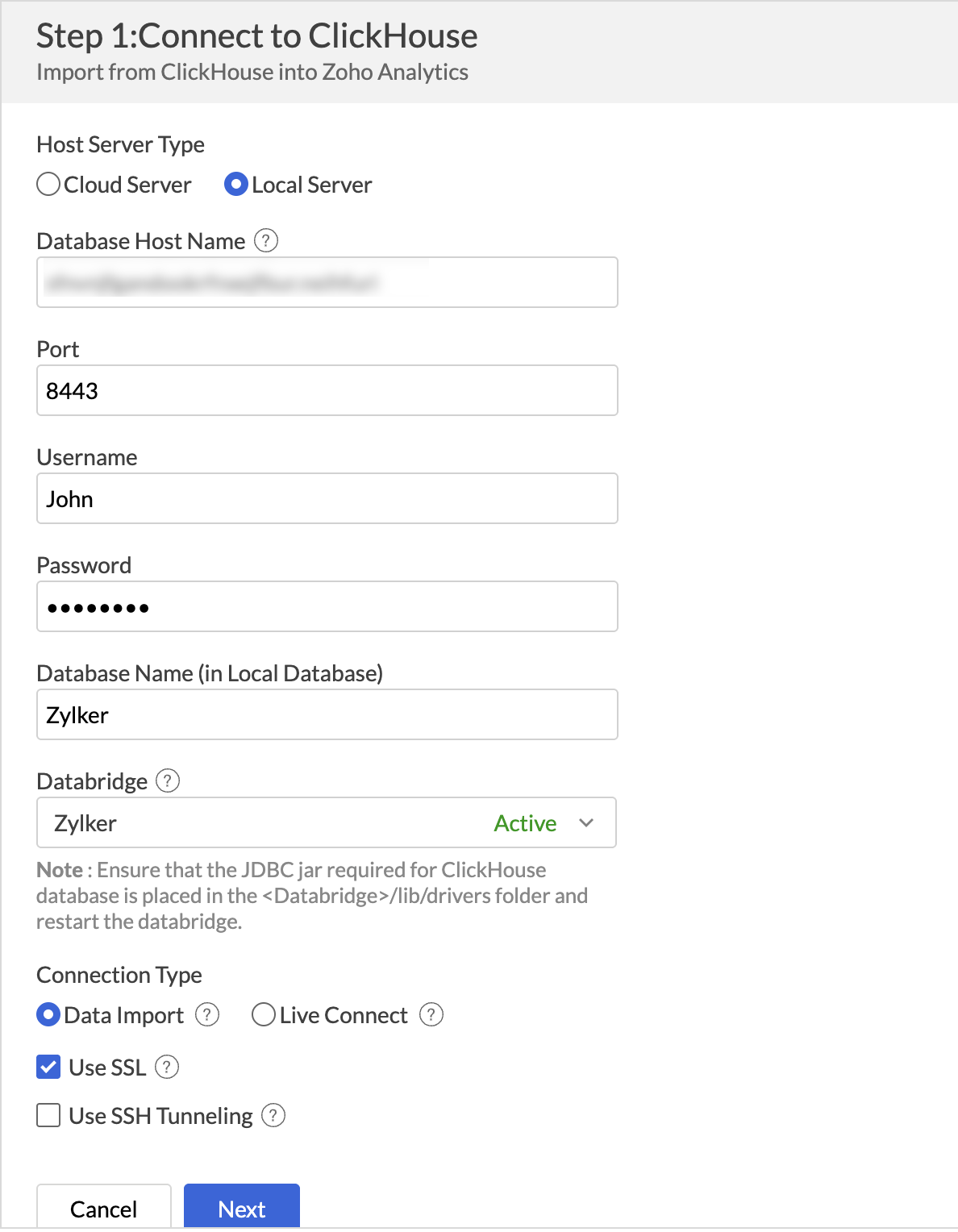 - The Use SSL checkbox is enabled by default to secure data transmission between ClickHouse and Zoho Analytics.