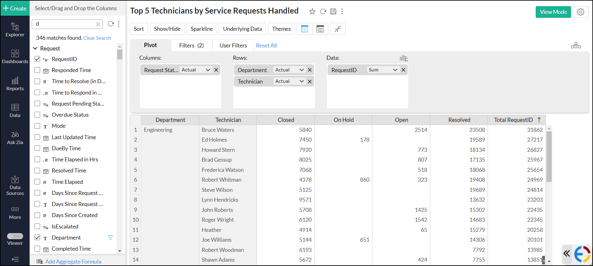 Open the required chart in Edit Design mode or create a new one. For instance, let's create a pivot view to visualize the Top 5 Technicians in each department based on the number of service requests they have handled.
