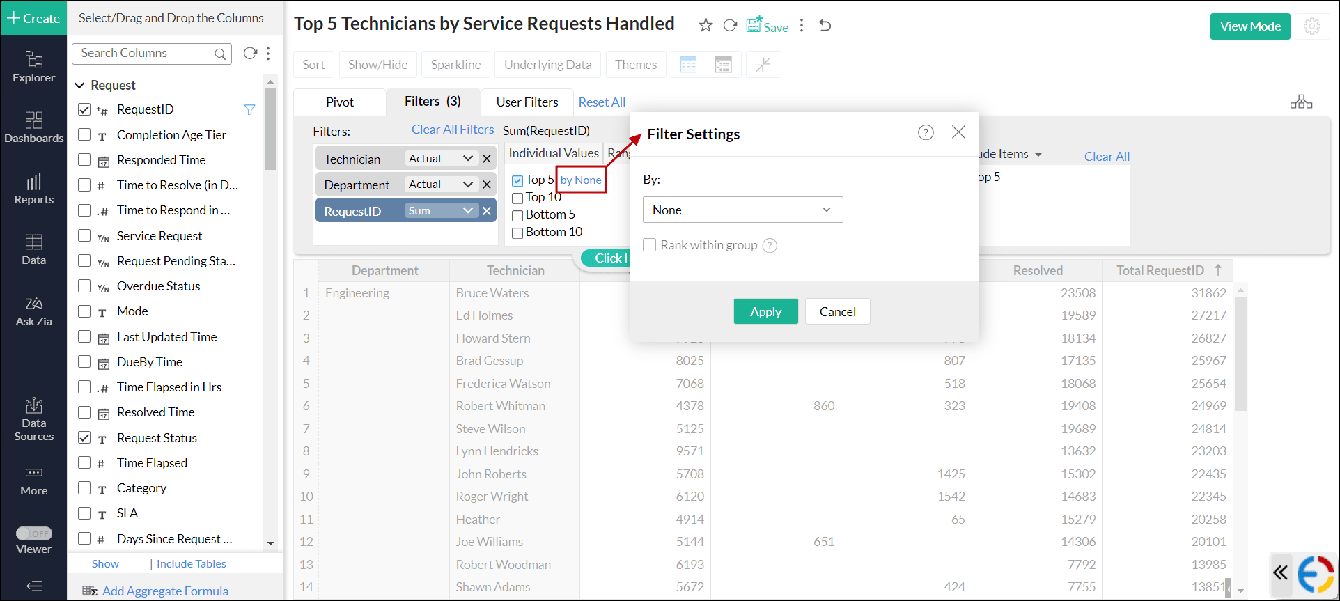 Fields used in the report: This option allows you to rank the data based on the fields added above the primary field selected for ranking in the designer shelf. In the example below, the Group and Department field is added above the Technician field (the primary field selected for ranking) in the designer shelf.